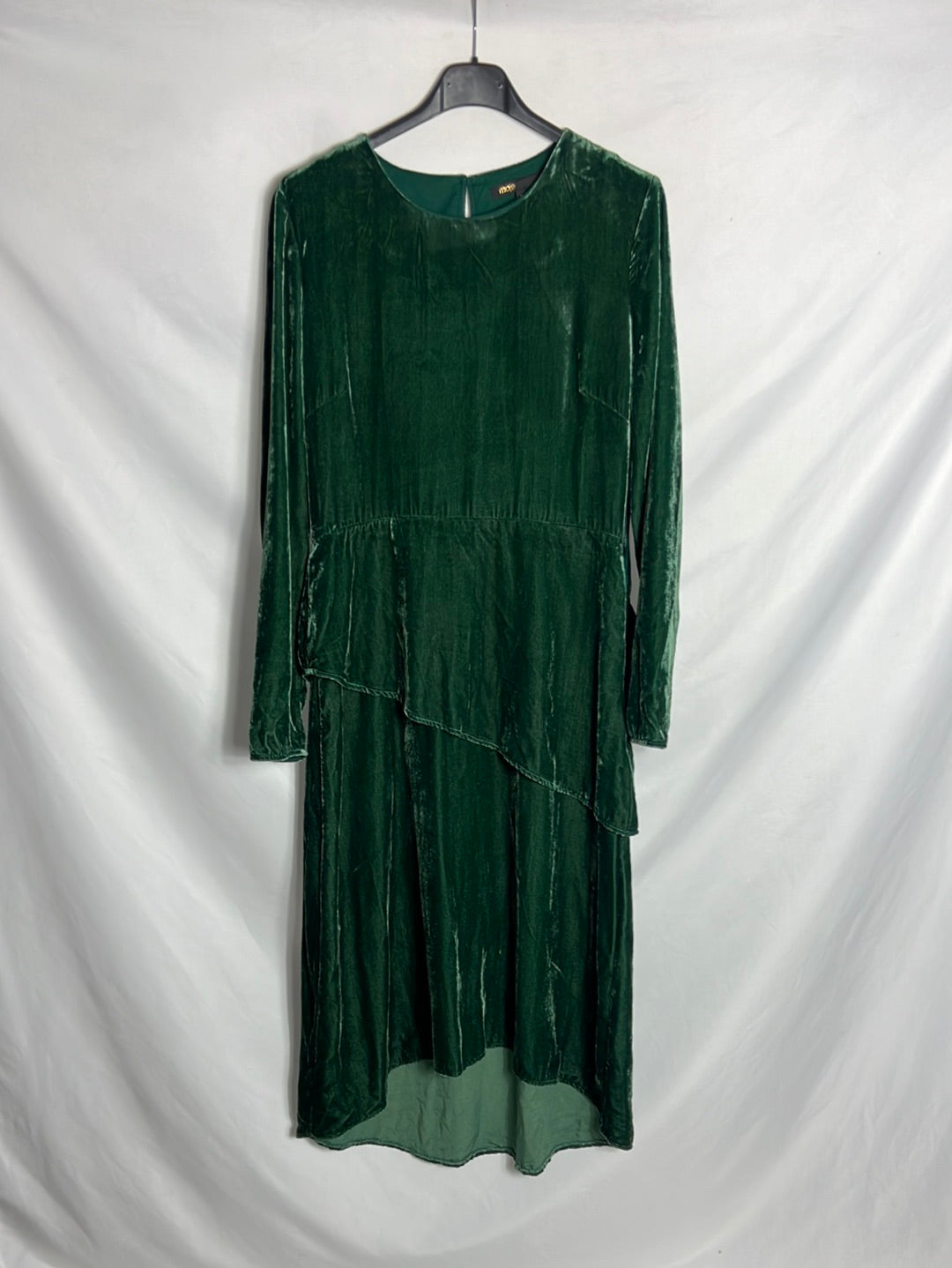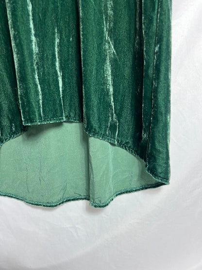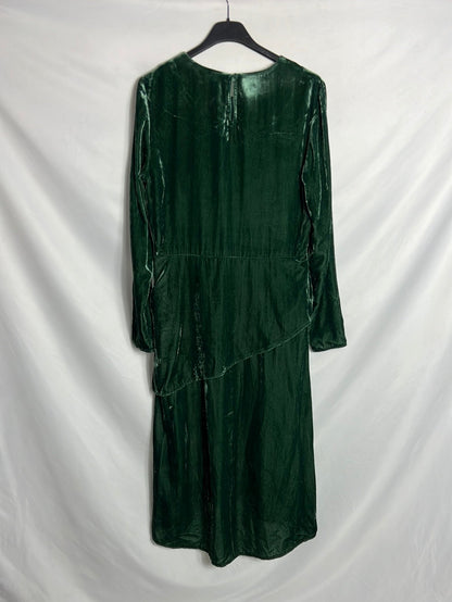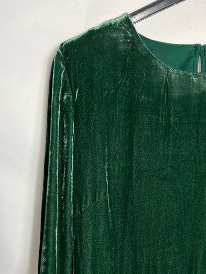 Vestido midi terciopelo verde. Hombros 38cm, cintura 36cm, largo 117 cm, no elástico y cremallera lateral . Tara: marca en el cuello podo perceptible