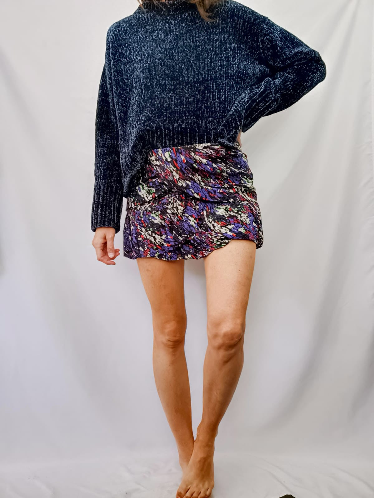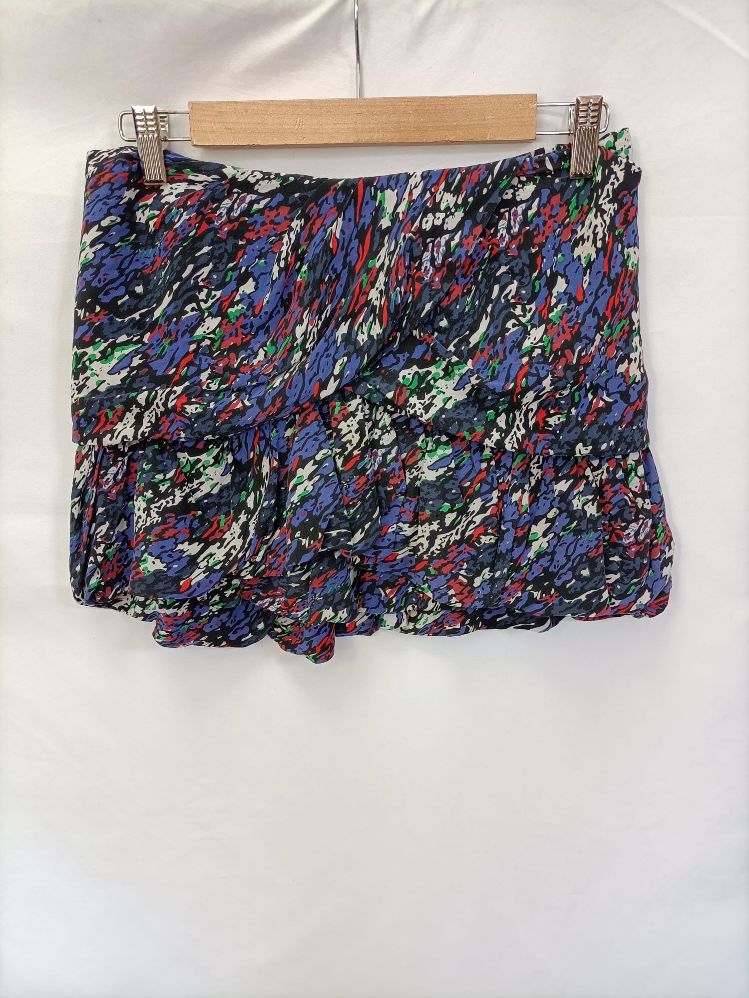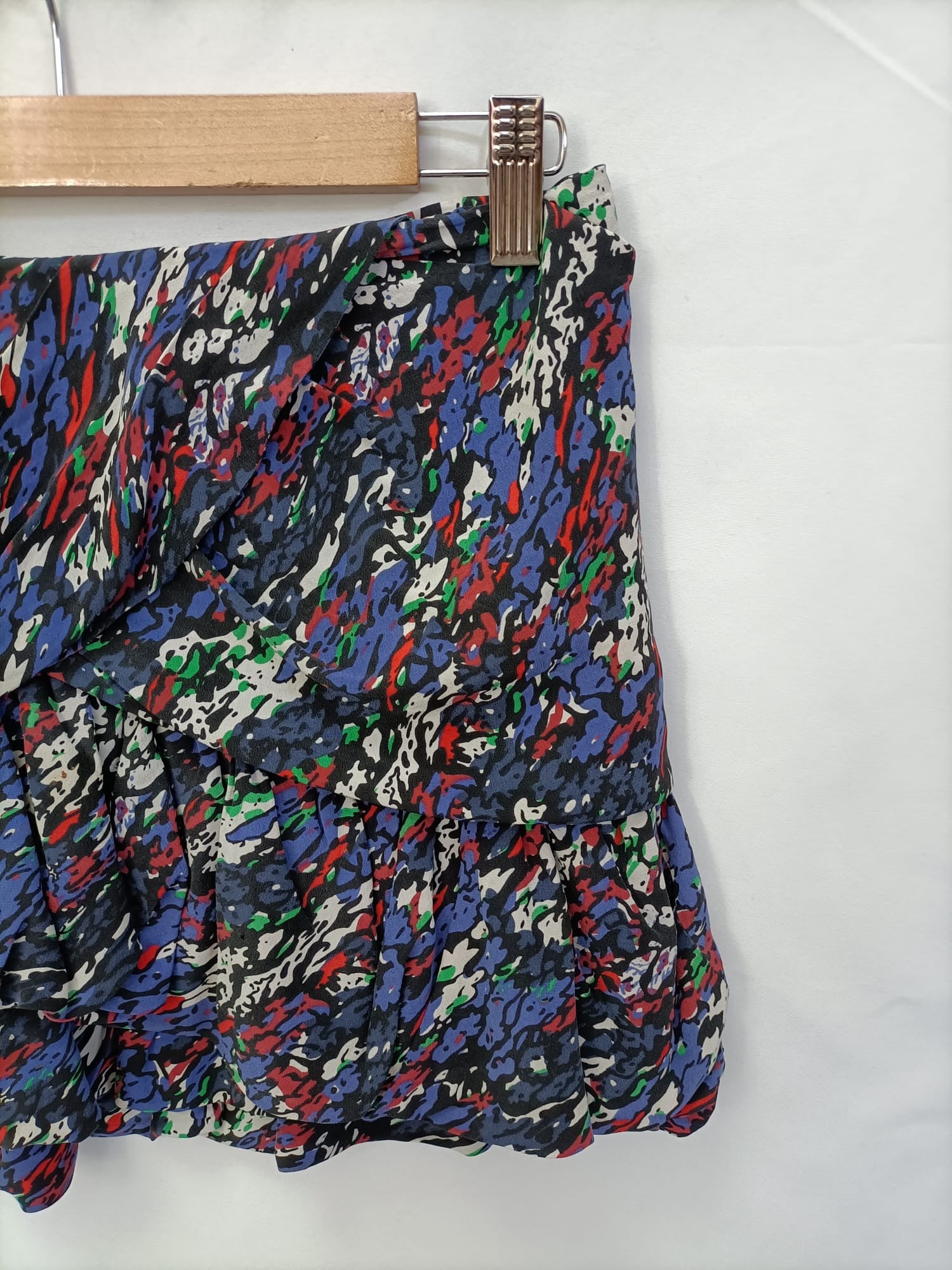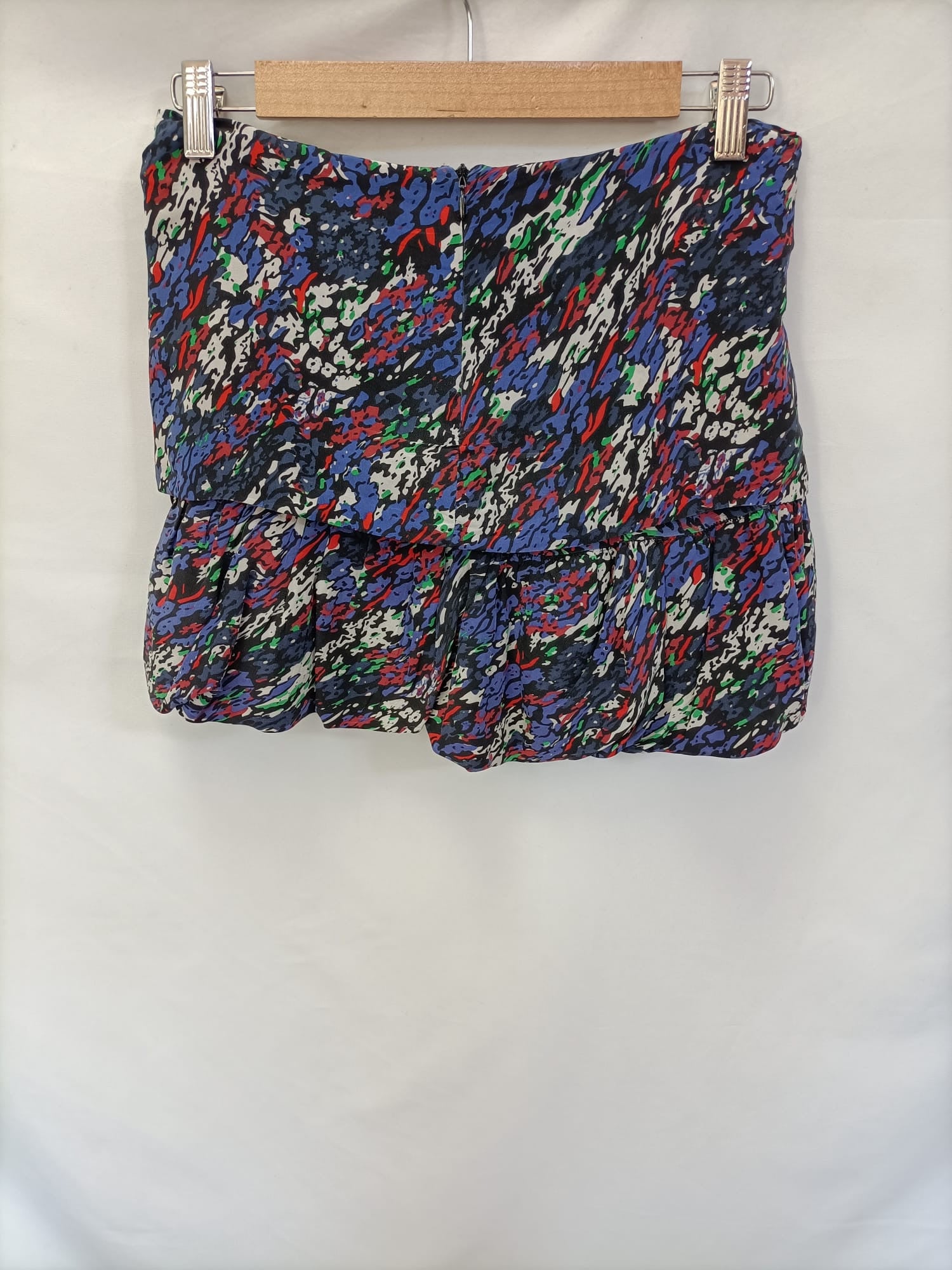 Falda corta de seda con estampado multicolor y detalles fruncidos. No elástica. Cintura 38 cm largo 36 cm