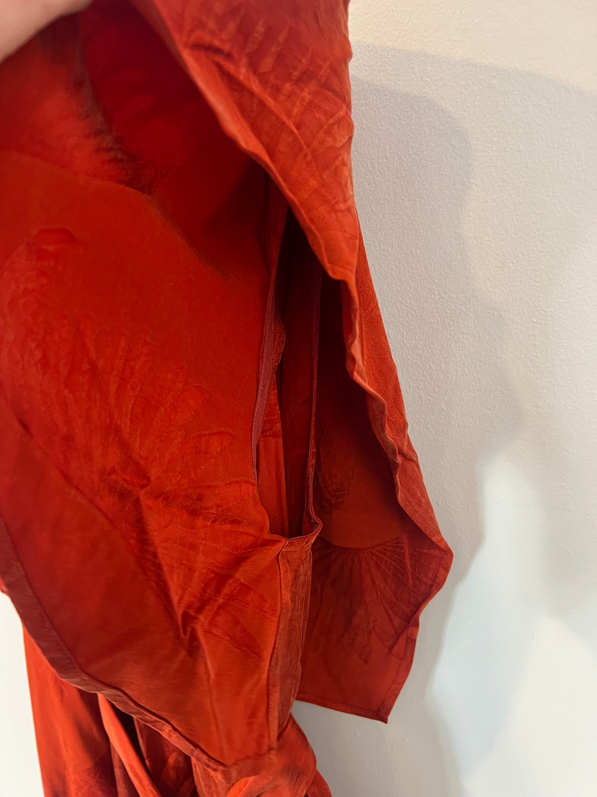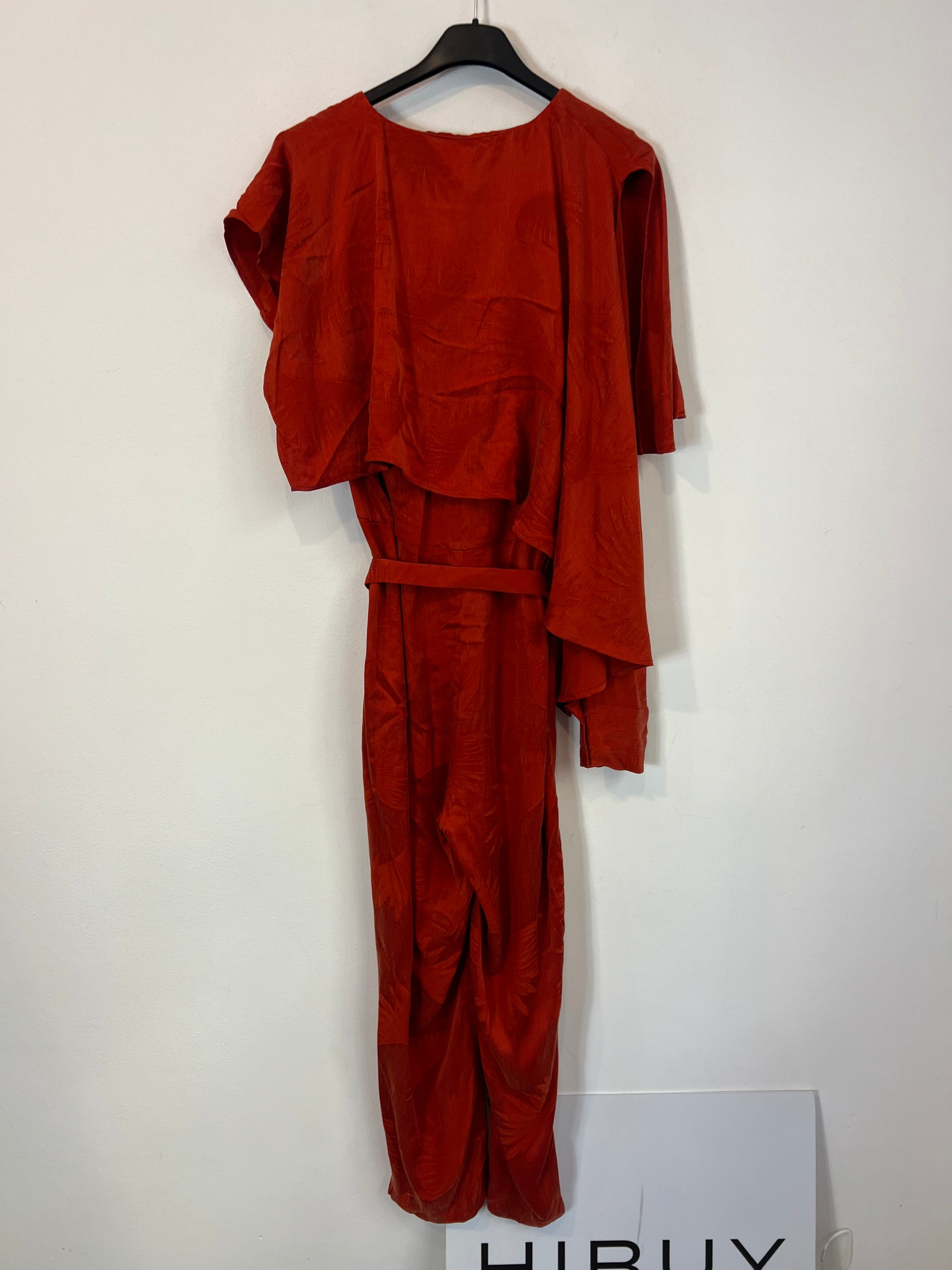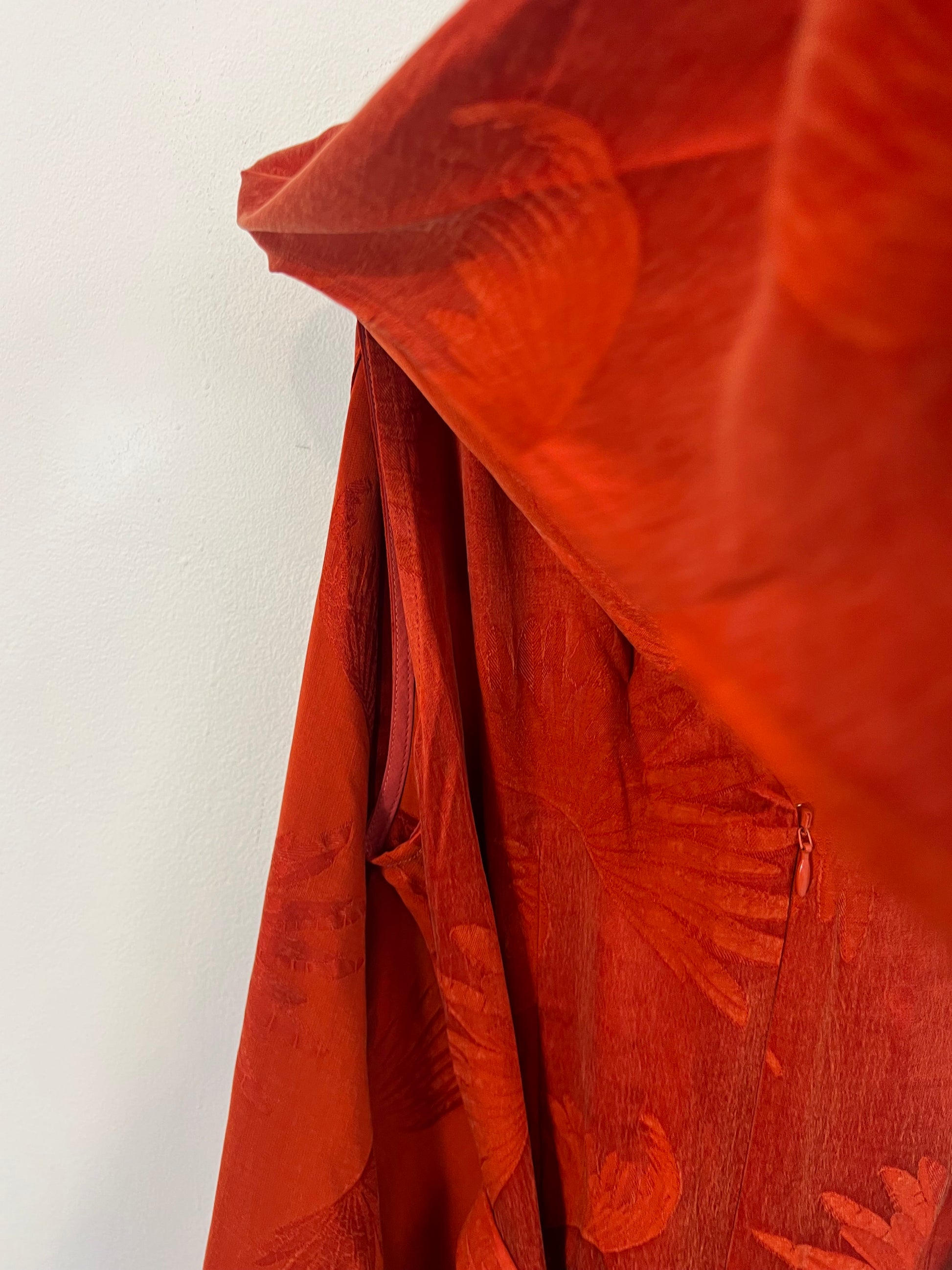 Mono fluido teja con tejido de flores. Detalle de volantes.
