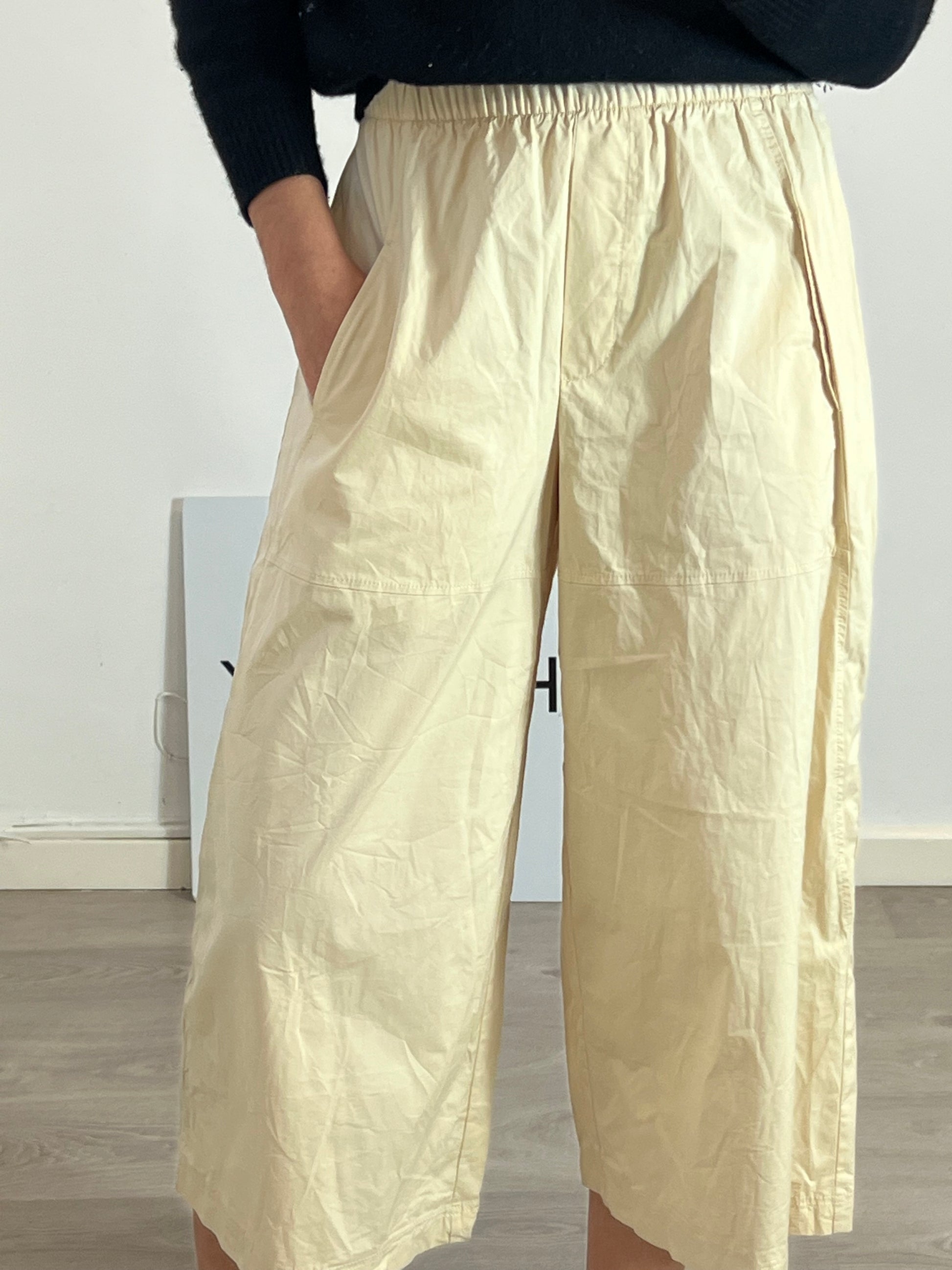 Pantalón beige ancho y fluido con cintura elástica. largo cm.
