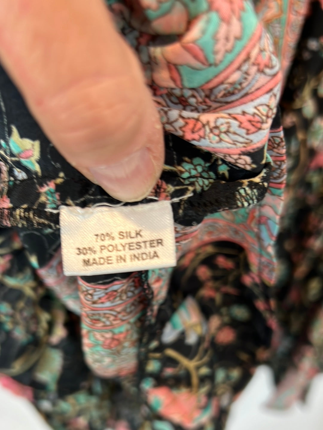 vestido corto negro con estampado de flores. Espalda elástica y tirantes ajustables.