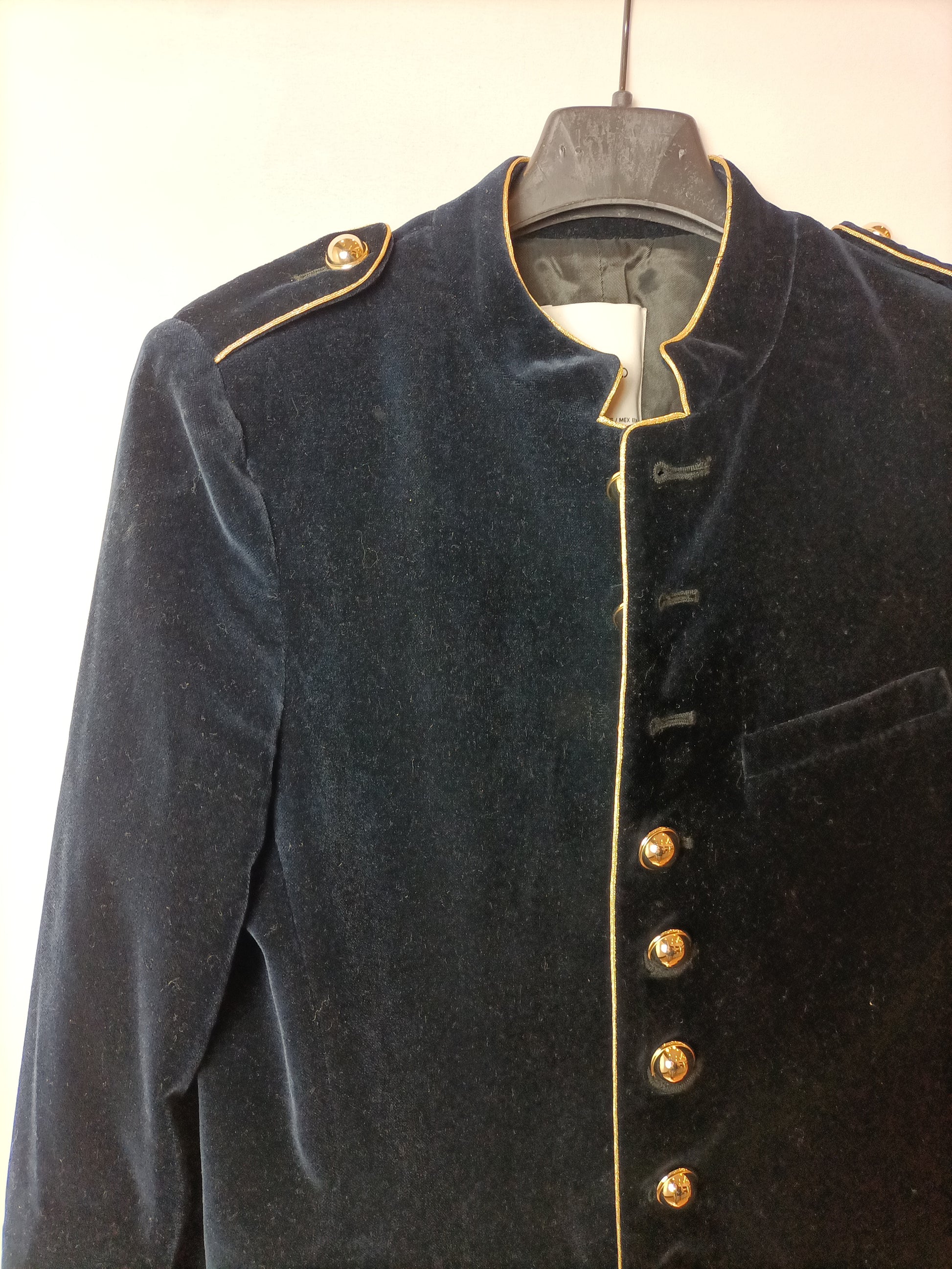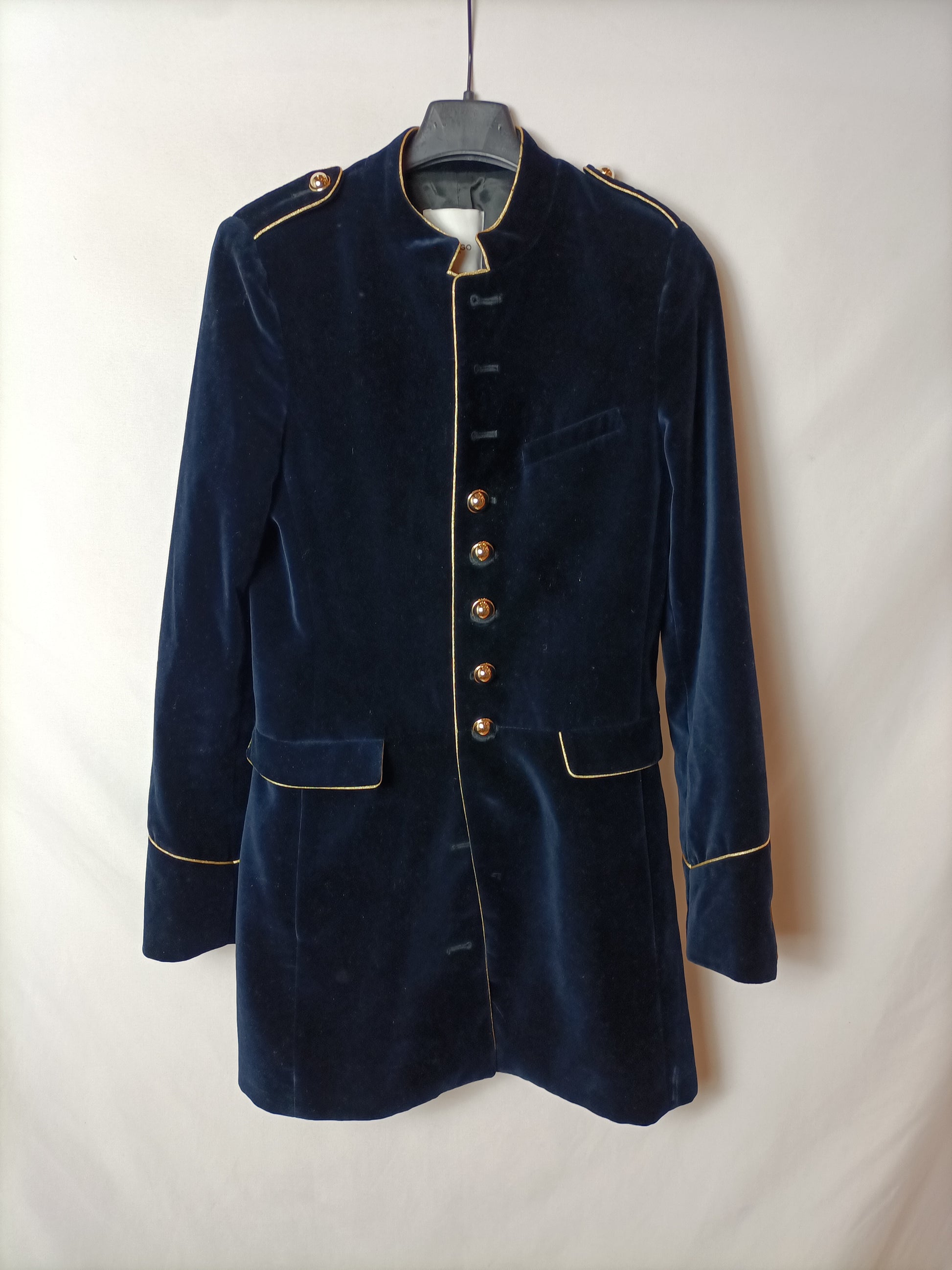 abrigo de terciopelo azul con detalle en dorado. de sisa a sisa 42 cm largo 80 cm