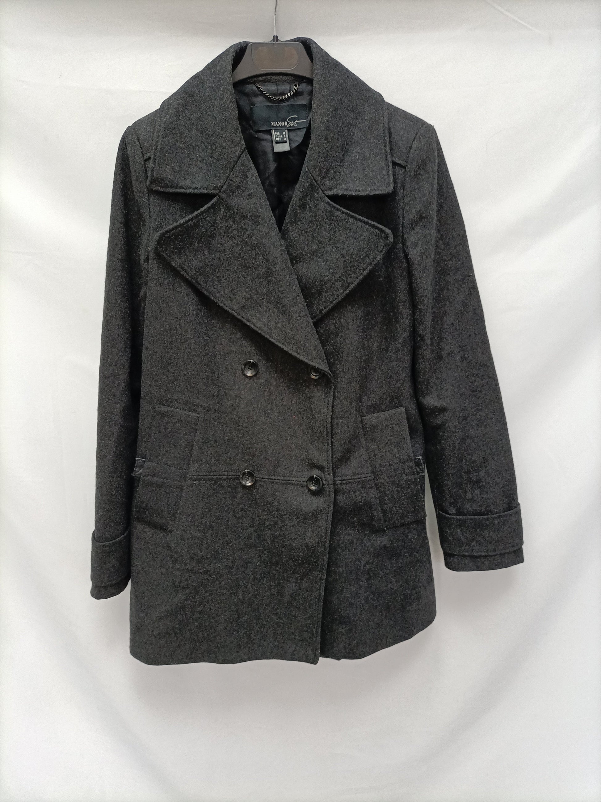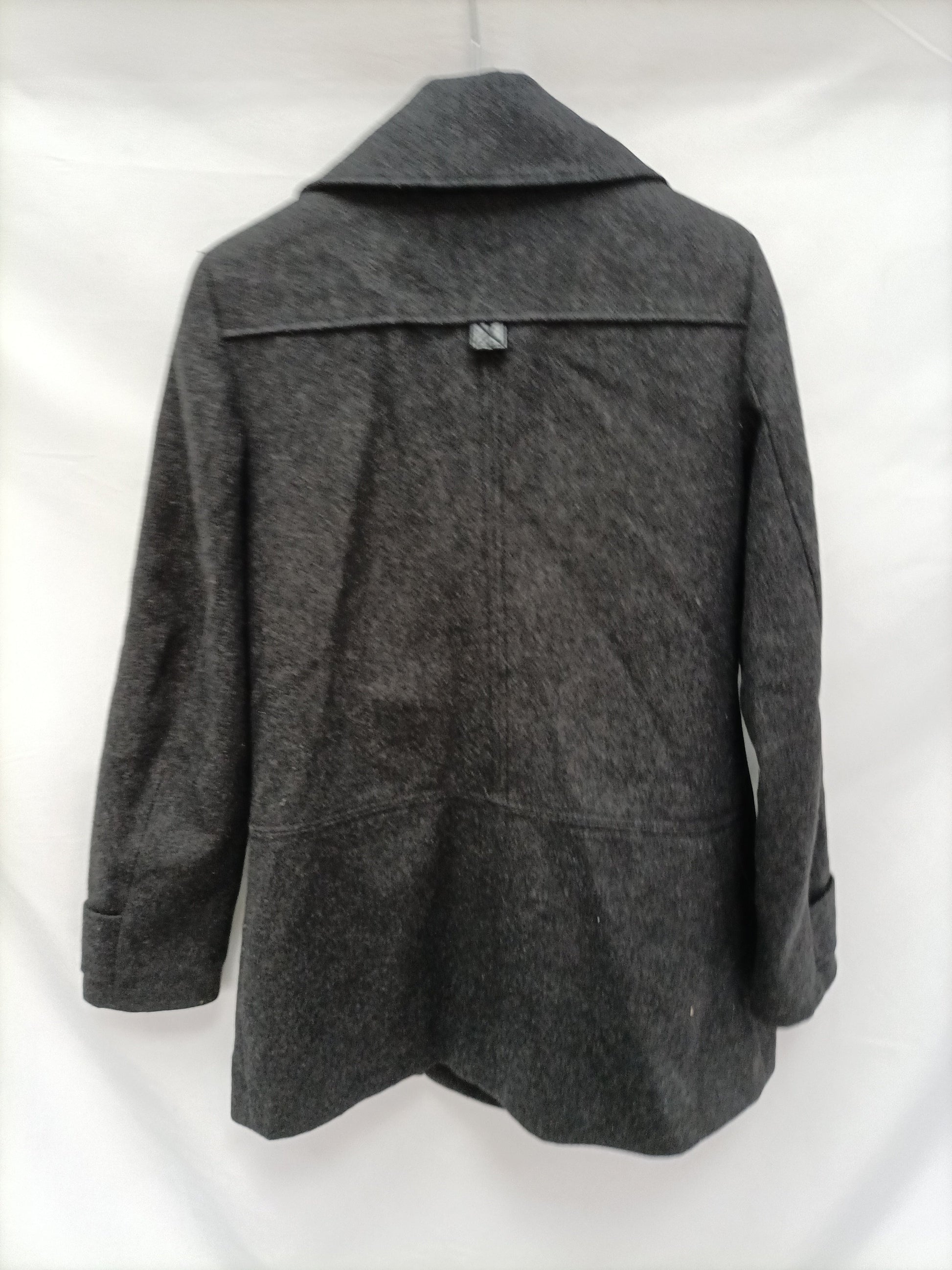 Abrigo gris oscuro de paño estilo jaspeado cruzado. No elástico. De sisa a sisa 45 cm largo 81 cm.