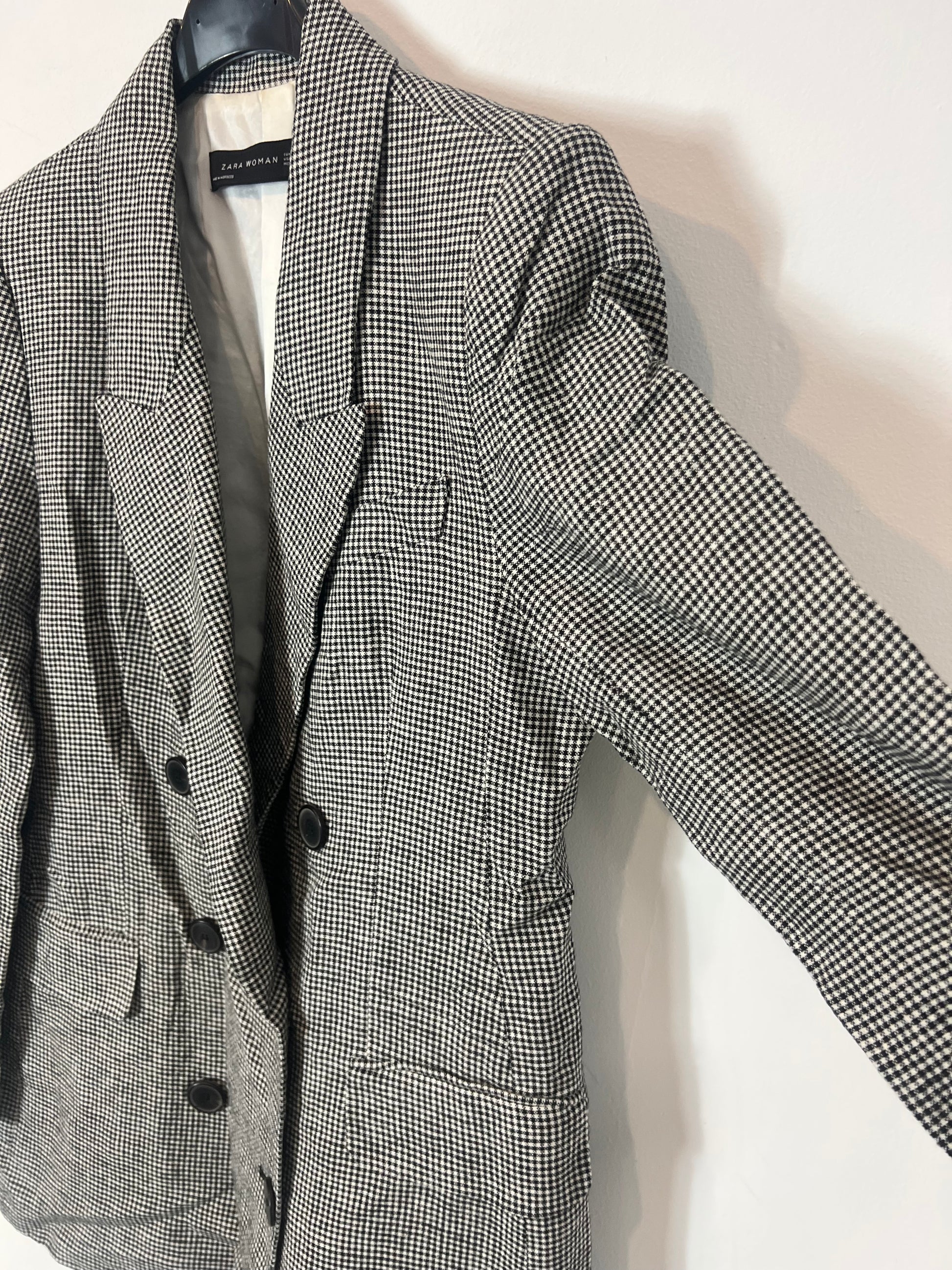 ZARA. Blazer con lino negra y blanca cuadros vichí T.s