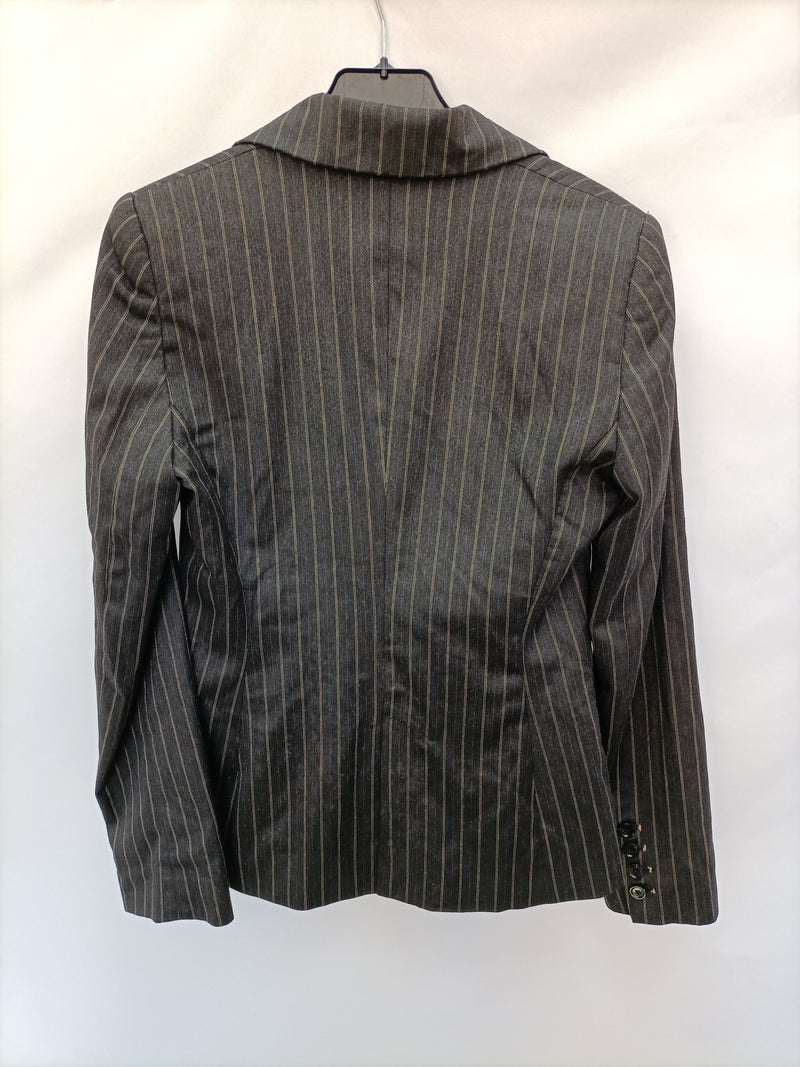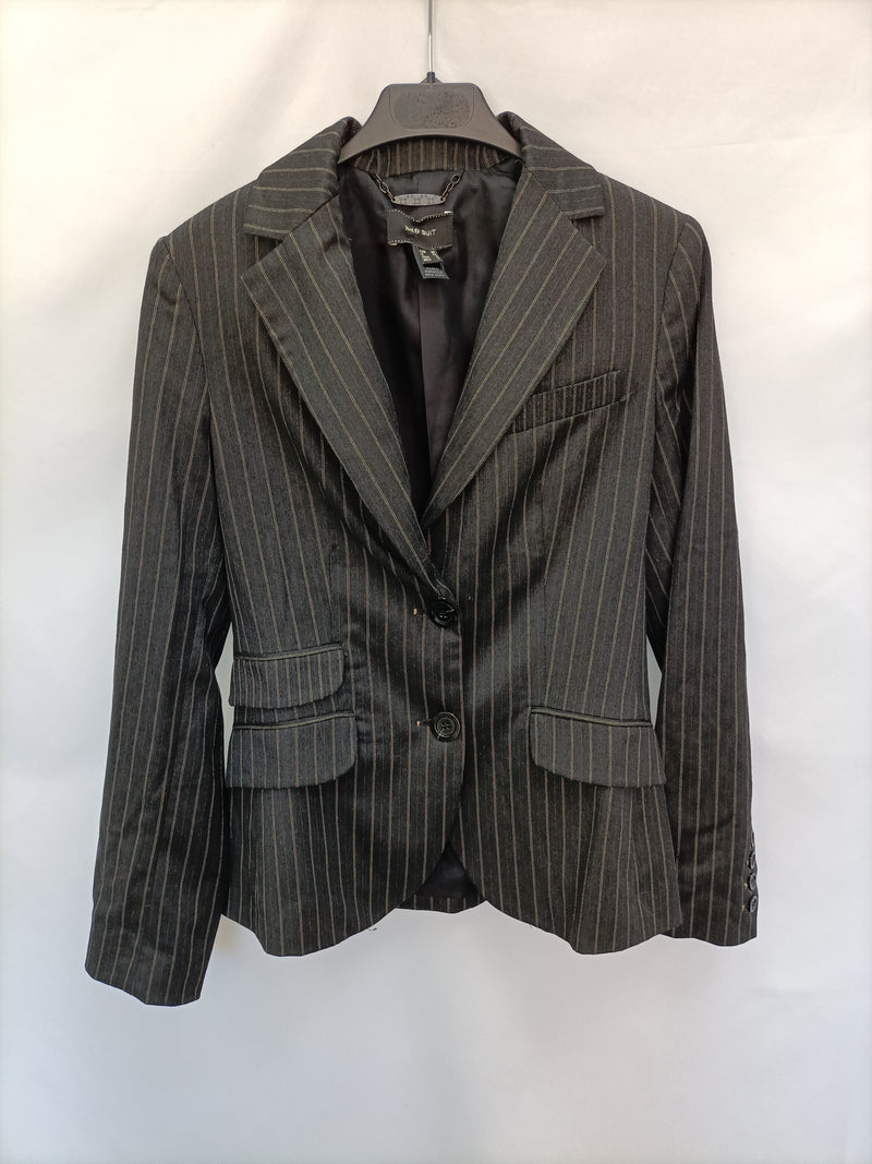 Blazer gris con rayas diplomáticas en beige, se abrocha con dos botones