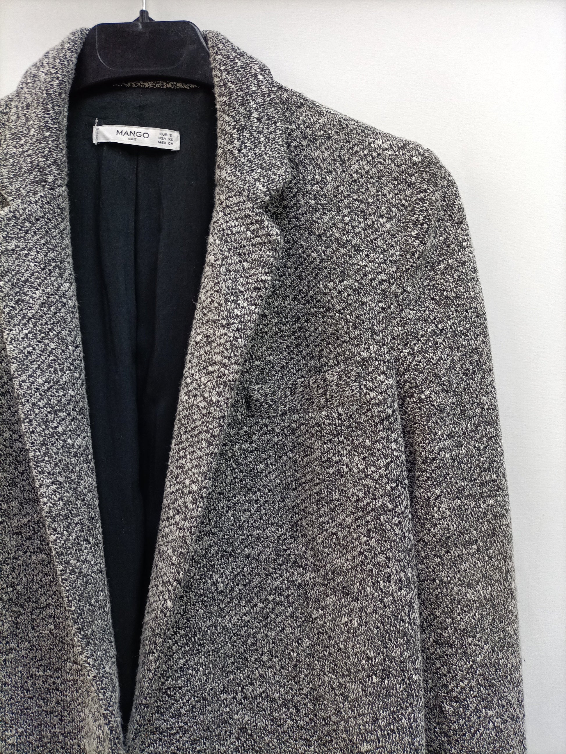 Blazer jaspeada gris y blanco. No Elastico. De sisa a sisa 43 cm Largo 69 cm. Tara: faltan dos botones