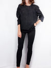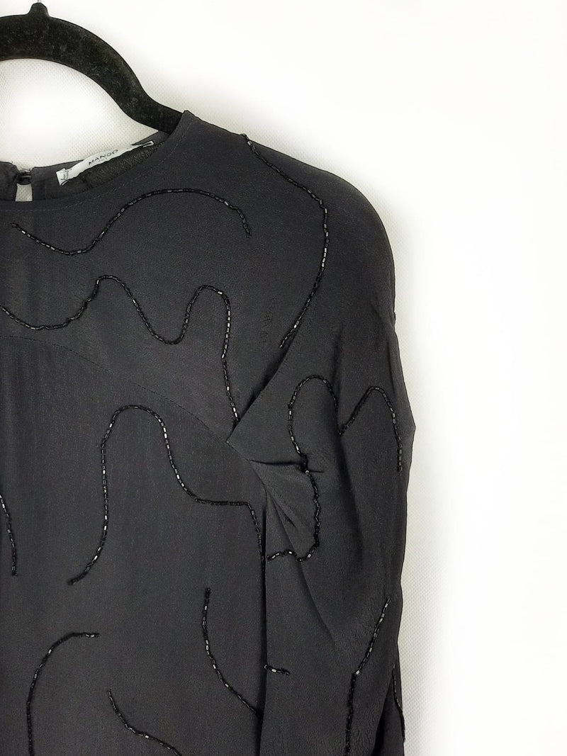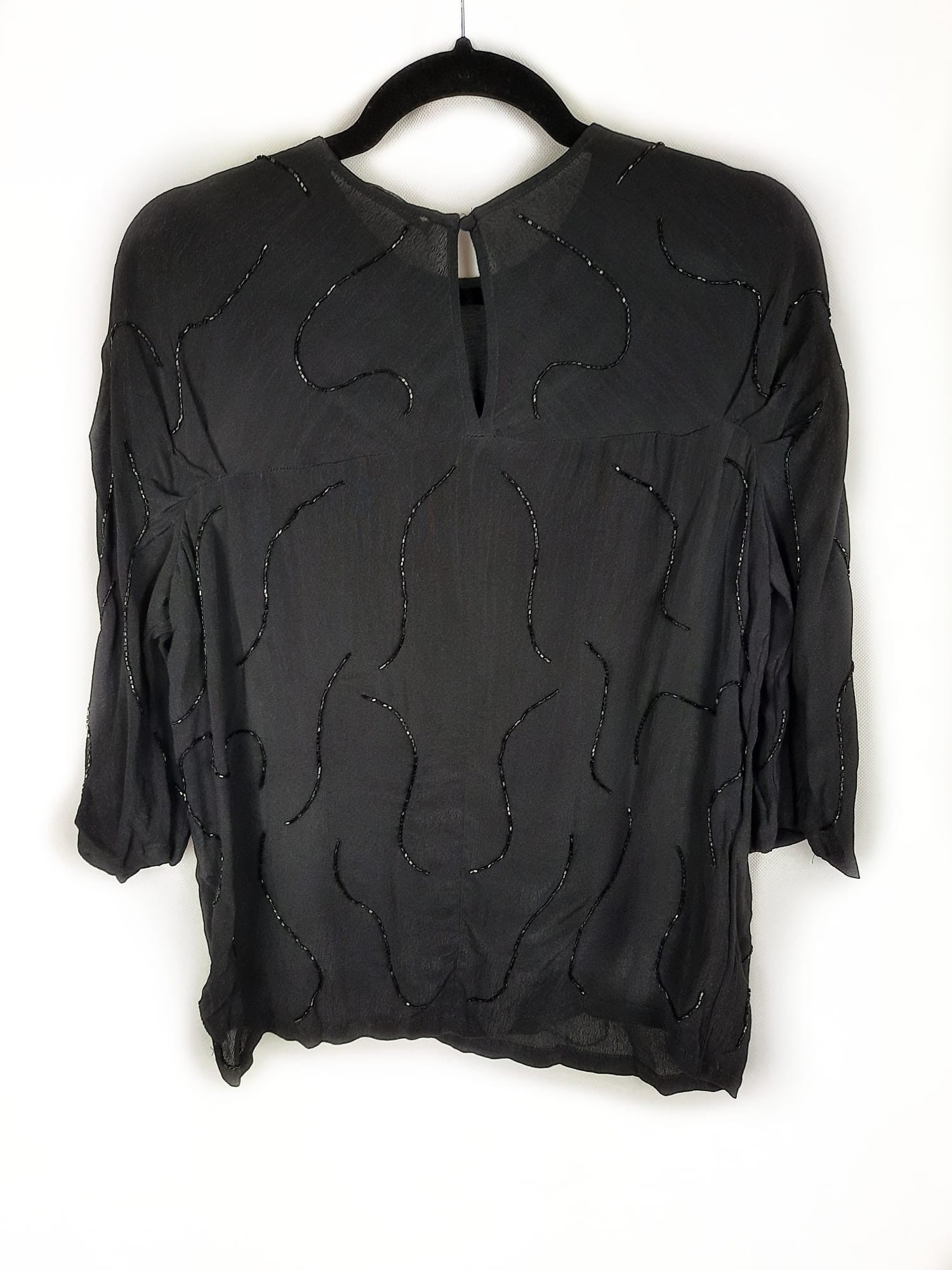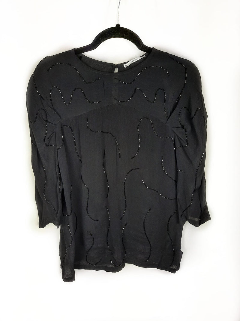 Blusa negra con detalles de pedrería. Mangas fruncidas en los hombros. No elástica. De sisa a sisa 49 cm largo 64 cm