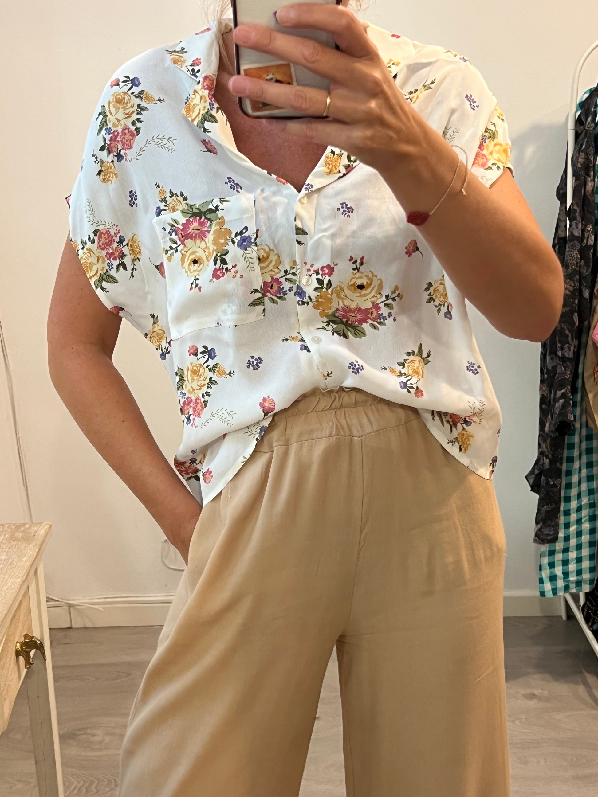 blusa beige fluida con estampado de flores.