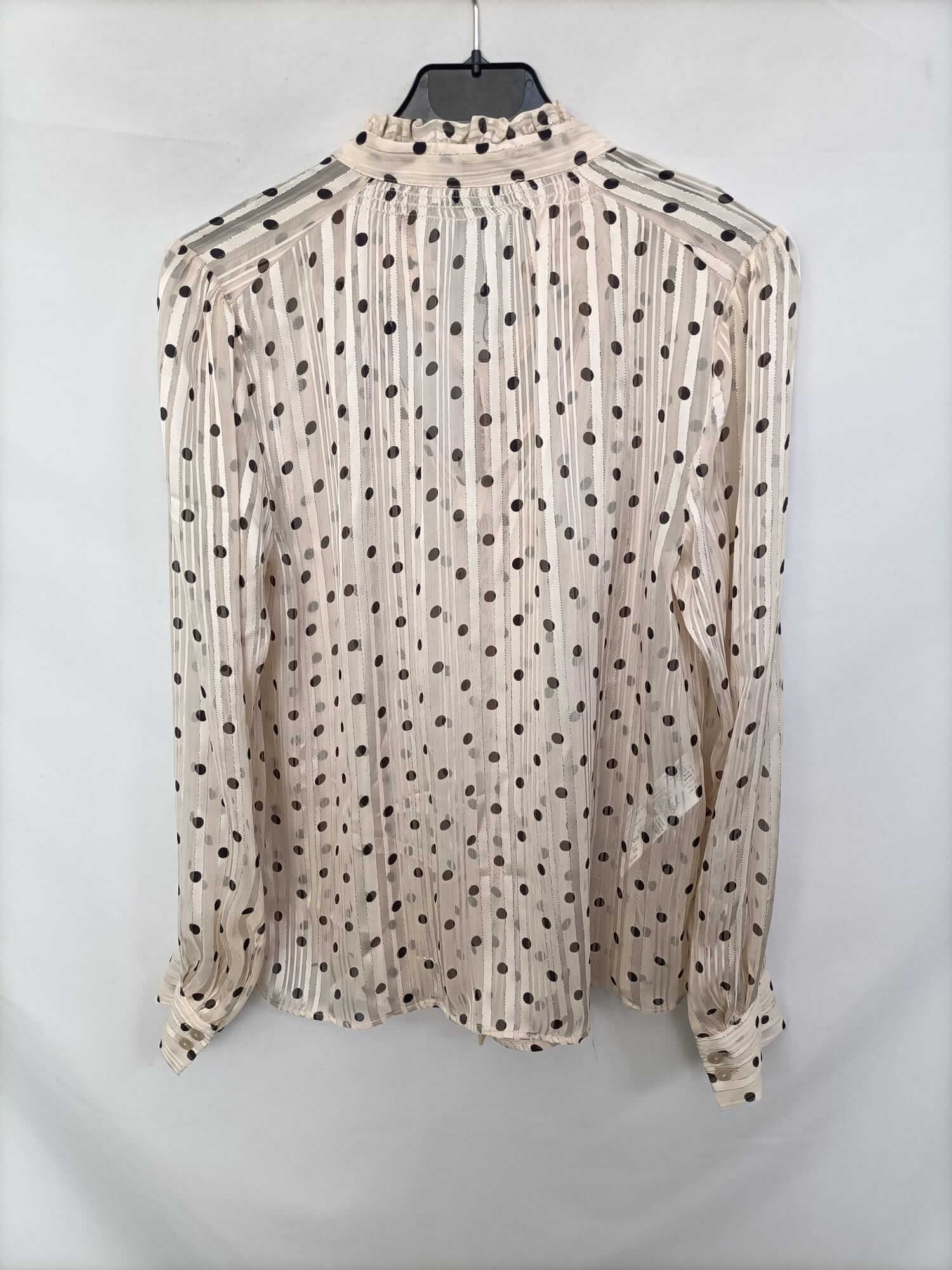 NUEVO CON ETIQUETA. Blusa beige fludis con rayas con hilos plateados y luanares negros. Semitransparente con detalle de lazada en el cuello. De sisa a sisa 49 cm largo 69 cm. 39,99