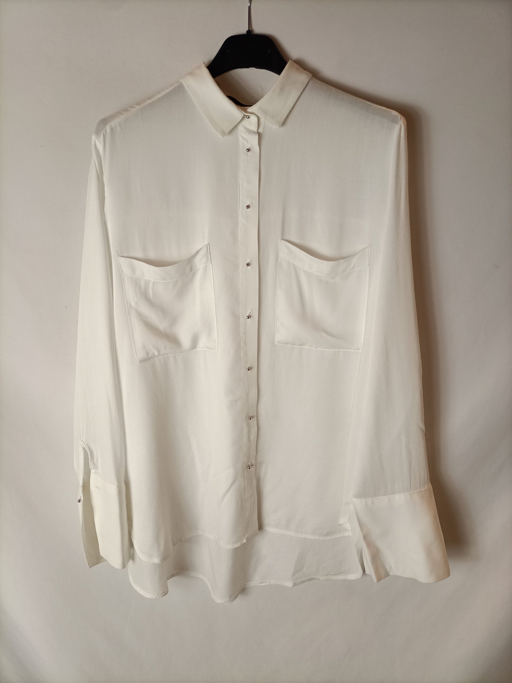 Blusa blanca con tejido in poco transparente. Botones de perlas plateadas.