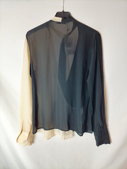 NUEVO CON ETIQUETA. blusa negra y beige cruzada con lazada en el cuello
