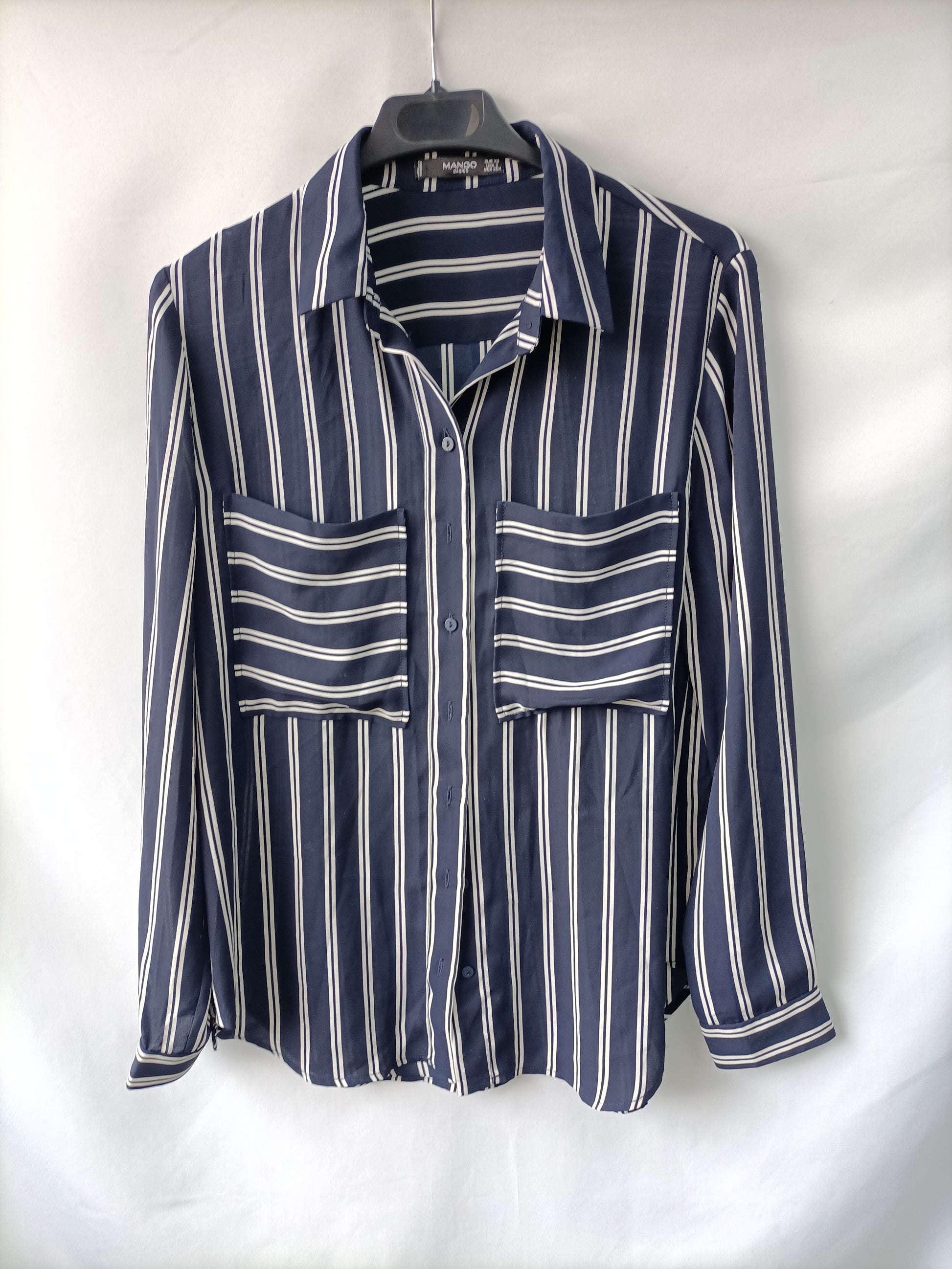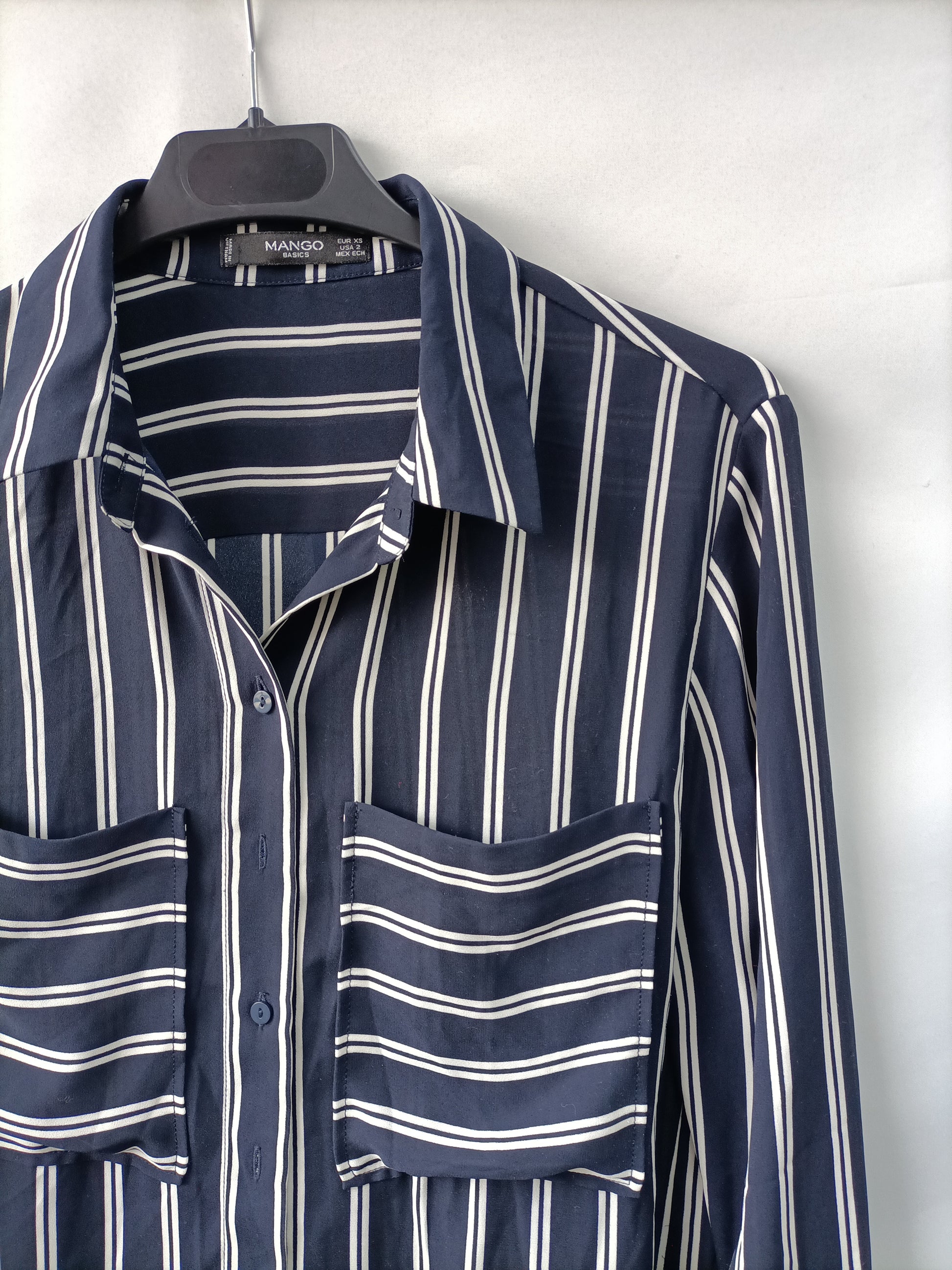 Camisa azul fluida con rayas blancas. Es finita. Largo 71 cm
