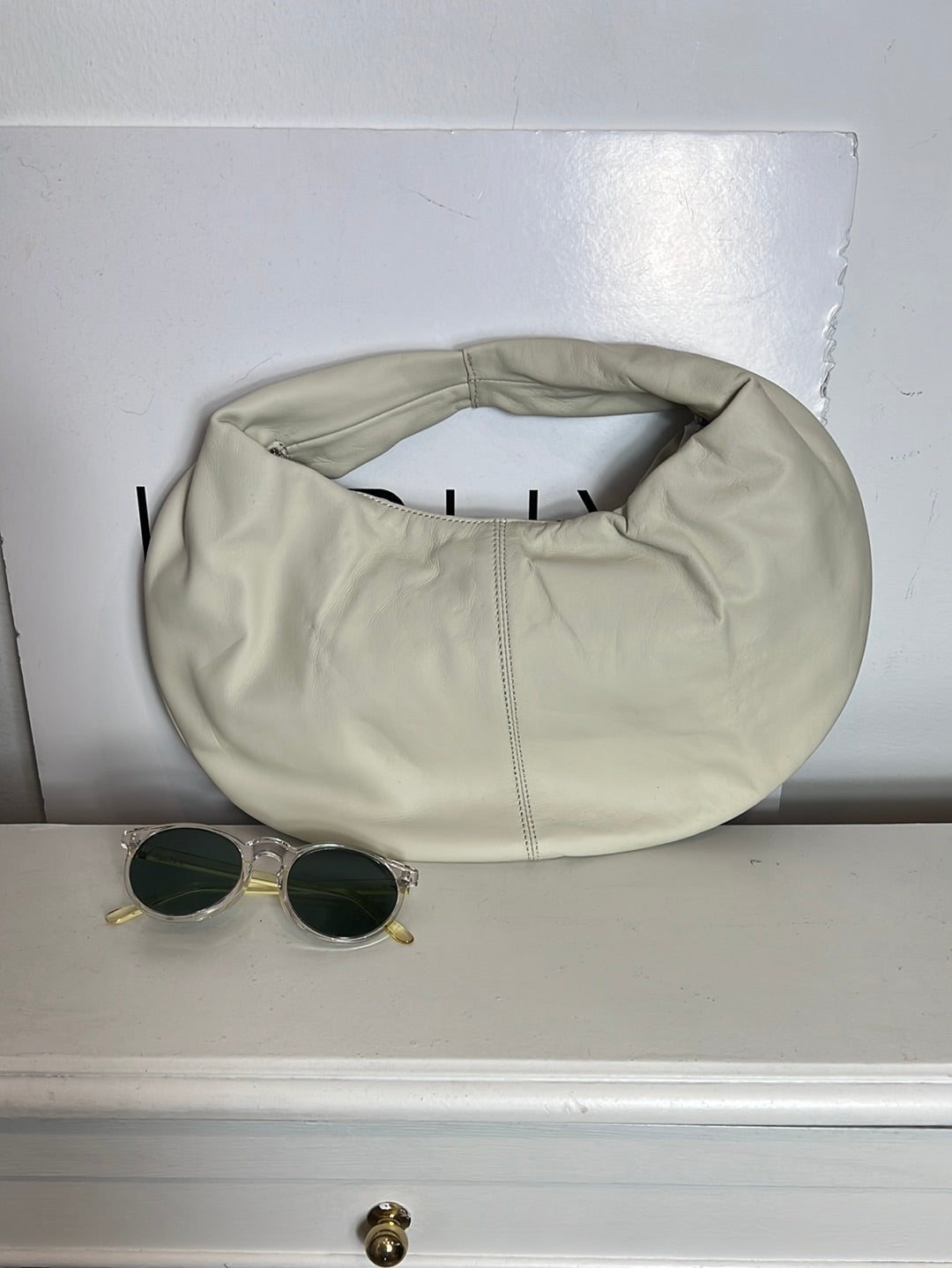 NUEVO CON ETIQUETA. Bolso media luna color piedra asa corta. Tara: la piel tiene alguna marca poco perceptible
