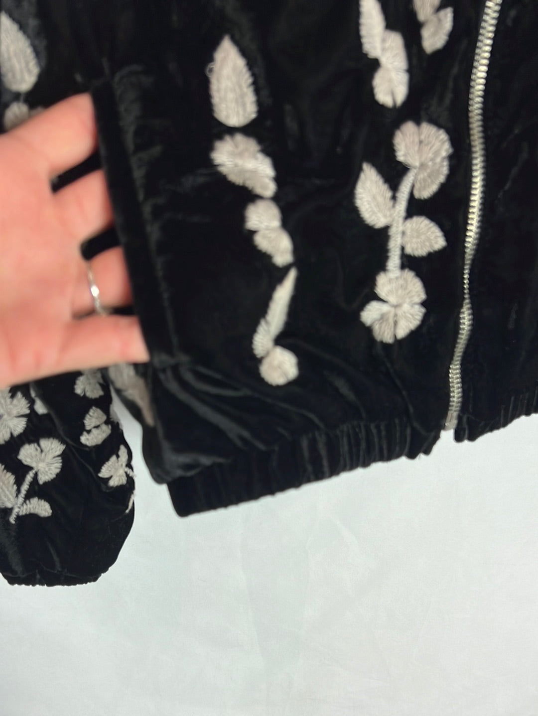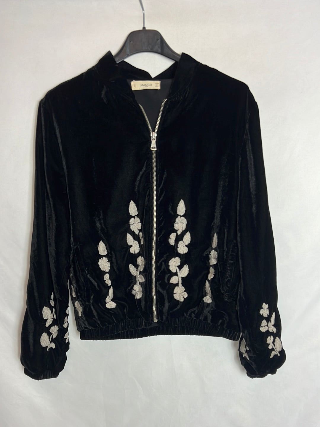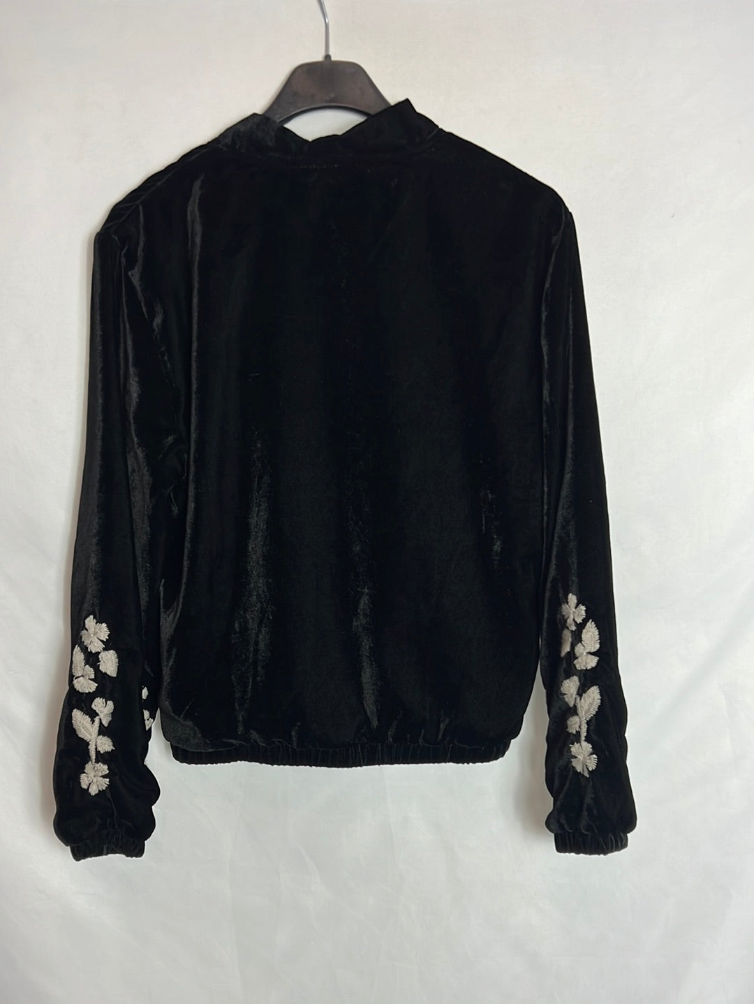 bomber negra de terciopelo con flores bordadas. Cintura elástica. a. de sisa a sisa 44 cm largo 54cm , hombros 39cm