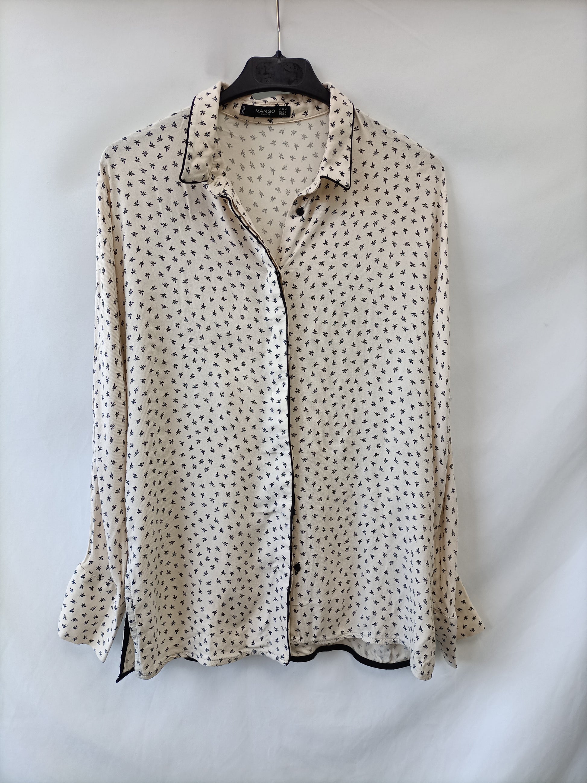 Mango blusa beige Hojas negras. Sisa amplia y largo 70 cm.