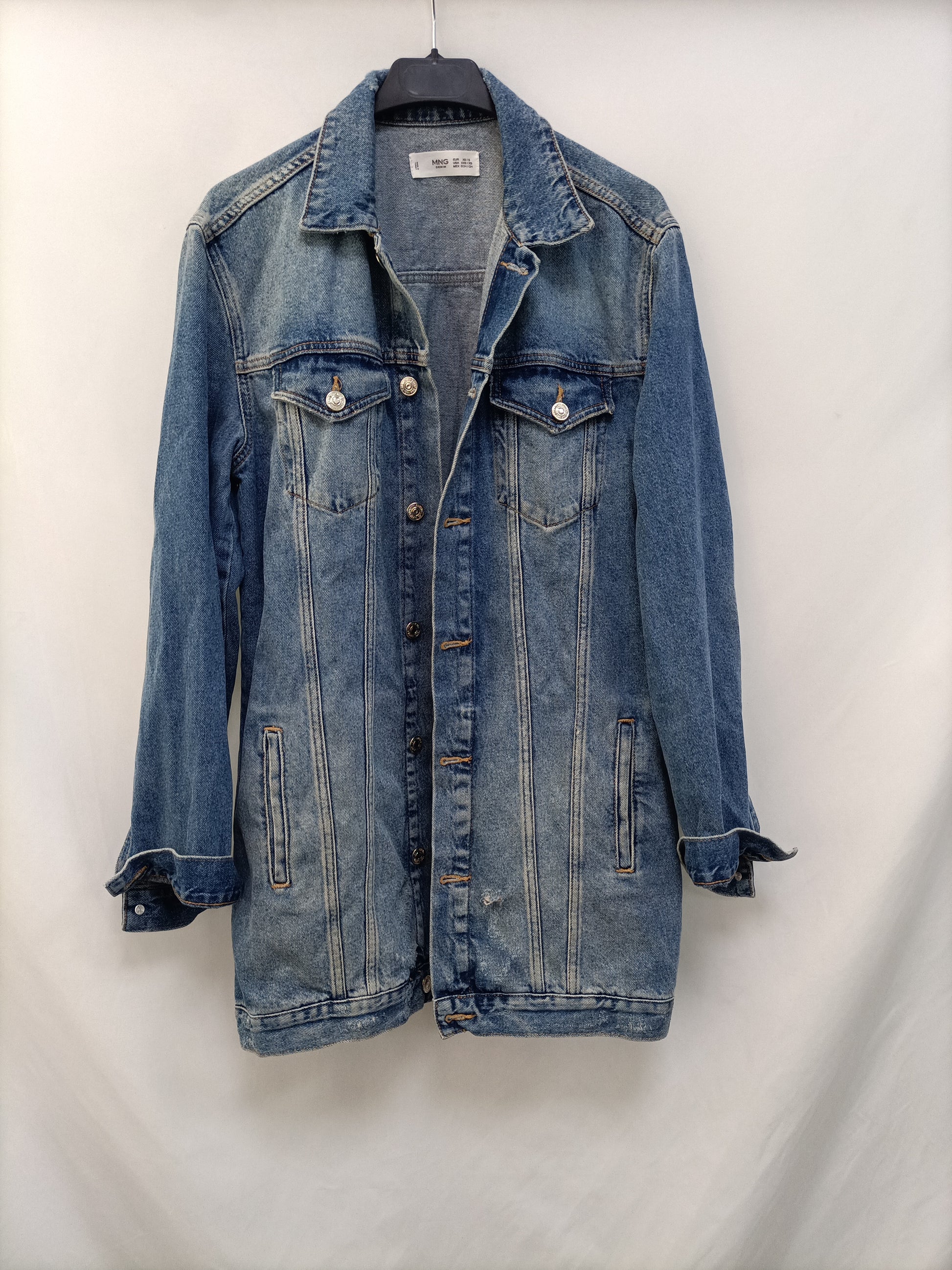 cazadora vaquera larga efecto desgastado. largo 82 cm