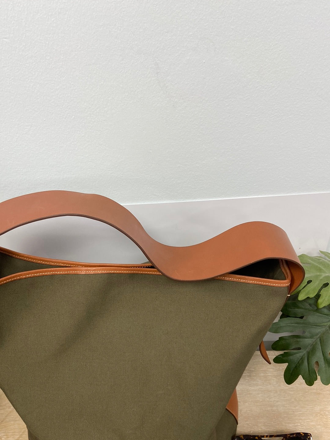 bolso maxi tela verde caza con asa marrón de piel. Colección de mango committed , bolsillo pequeño interiorZ no se cierra .