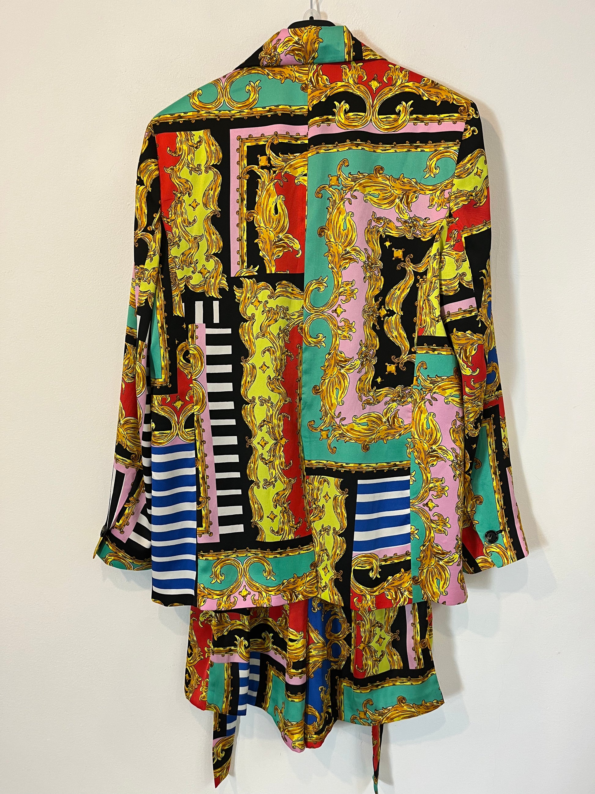 NUEVO CON ETIQUETA. Total look blazer y pantalón corto fluido. Estampado colores y dorado. Blazer de sisa a sisa 47 cm largo 77 cm. pantalón cintura 34 cm largo 38 cm