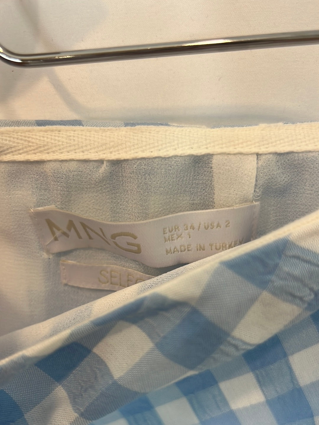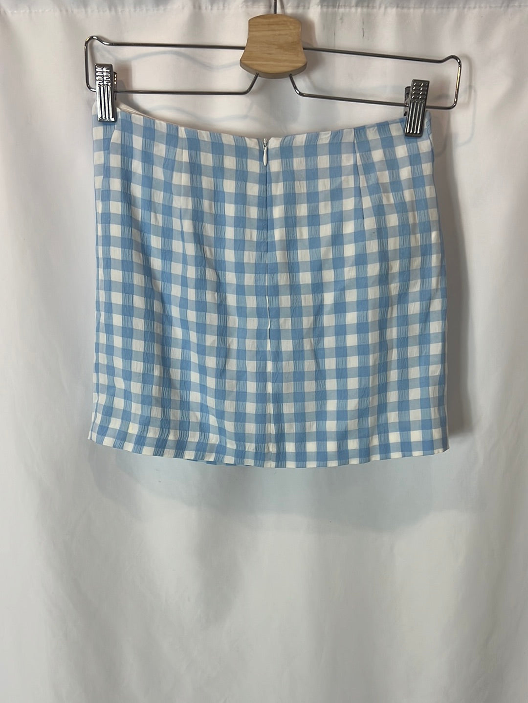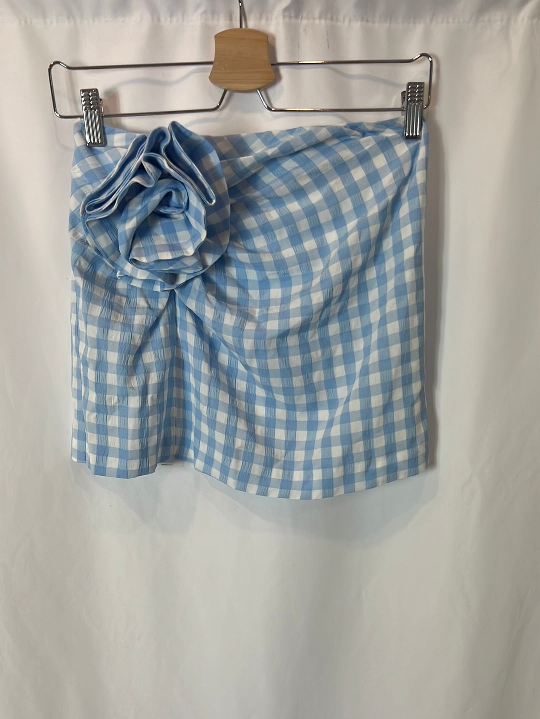 falda corta de cuadros vichy azules con detalle de flor. Cibtura 34cm, largo 34cm