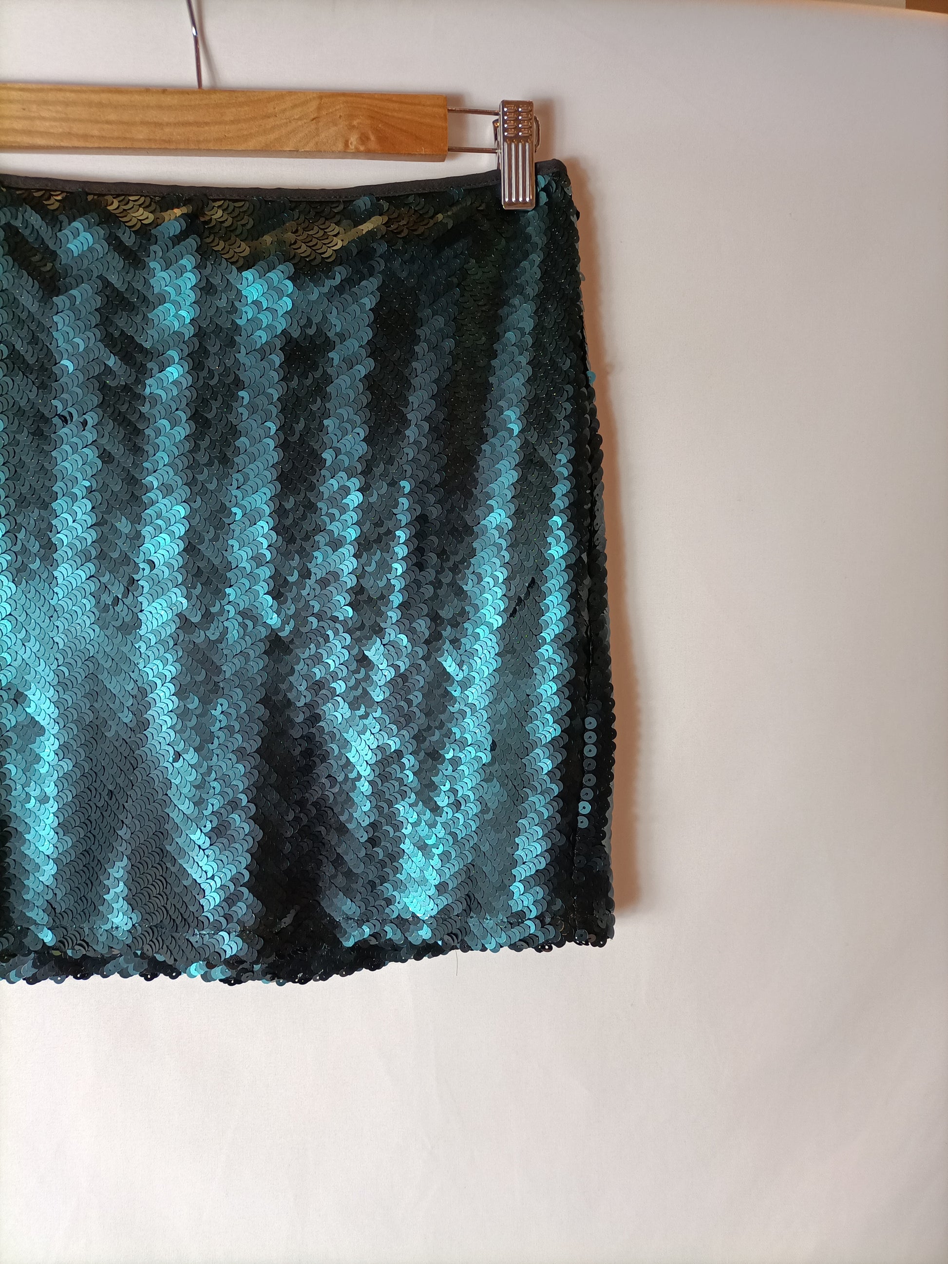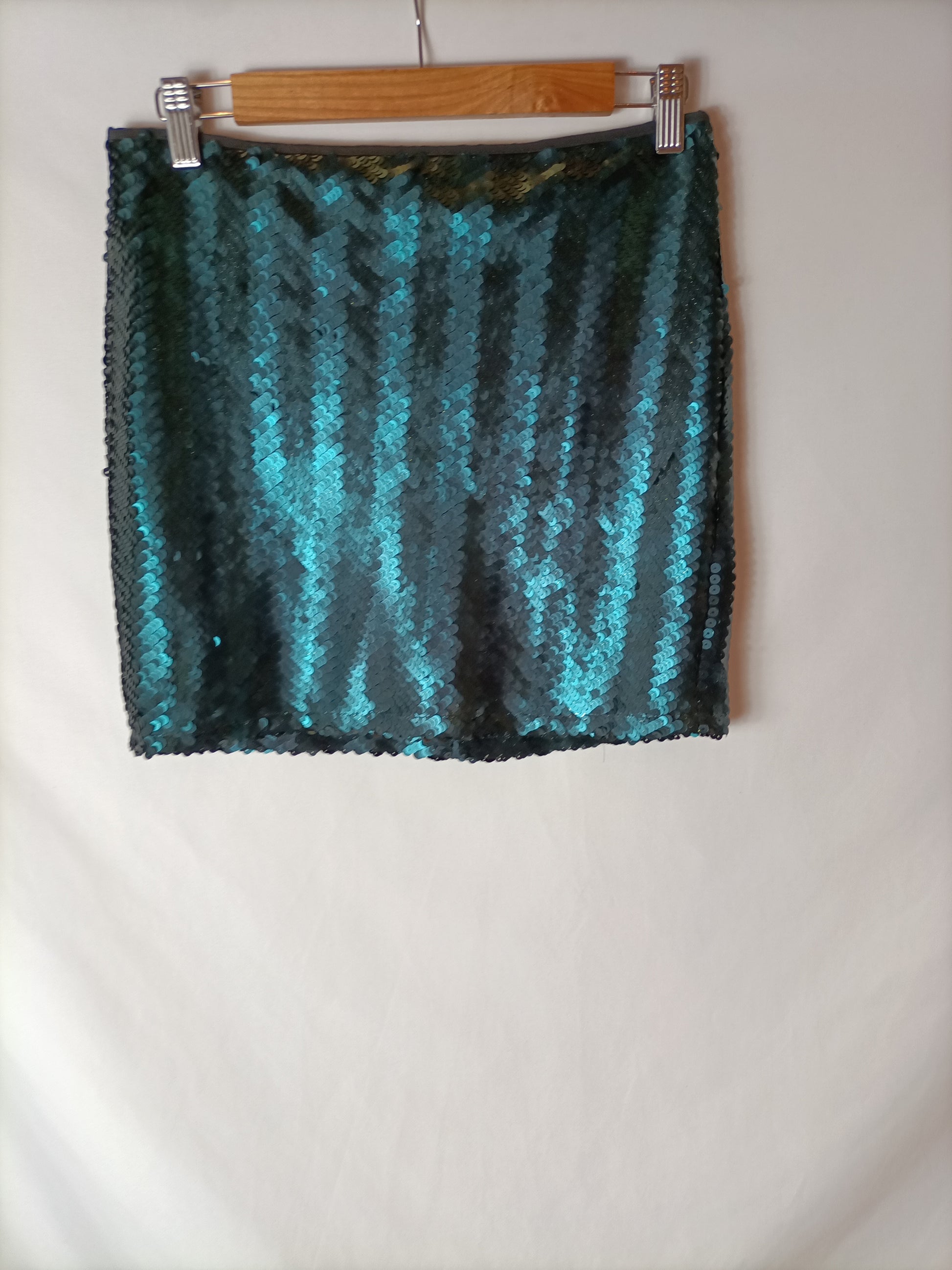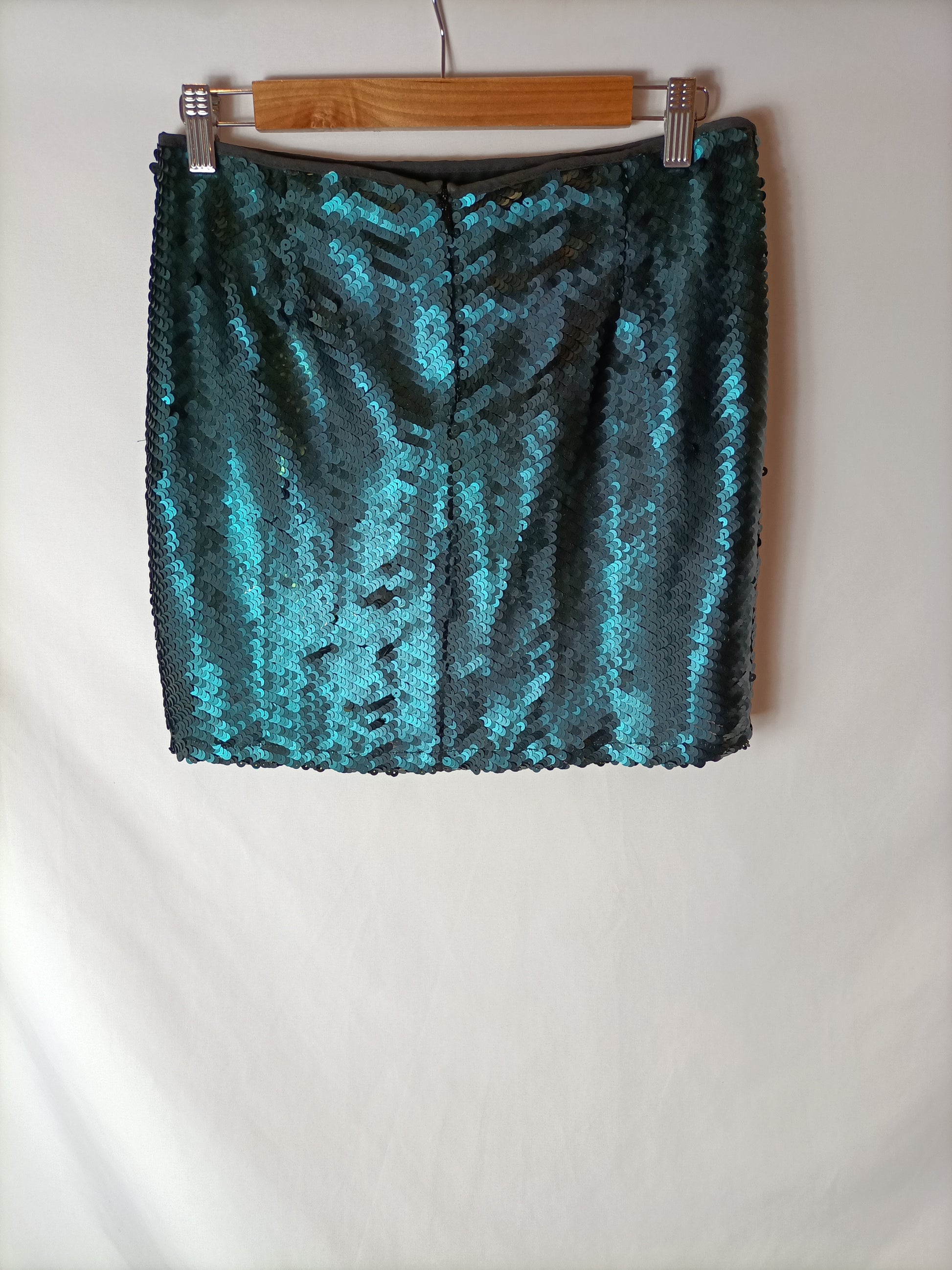 falda corta de lentejuelas en tonos verdes. no elástica. cintura 38 cm largo 40 cm