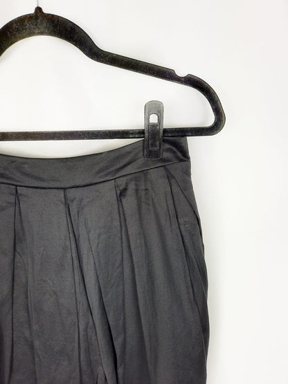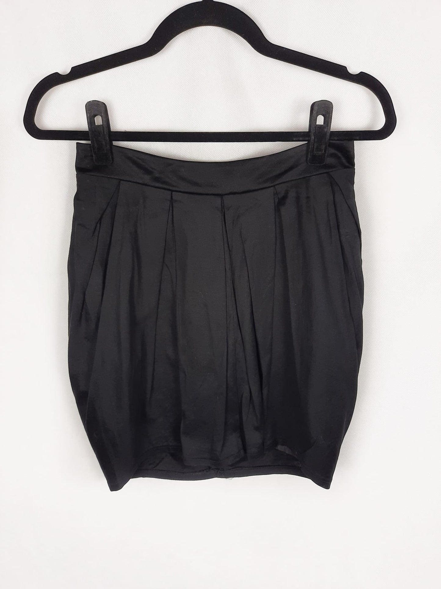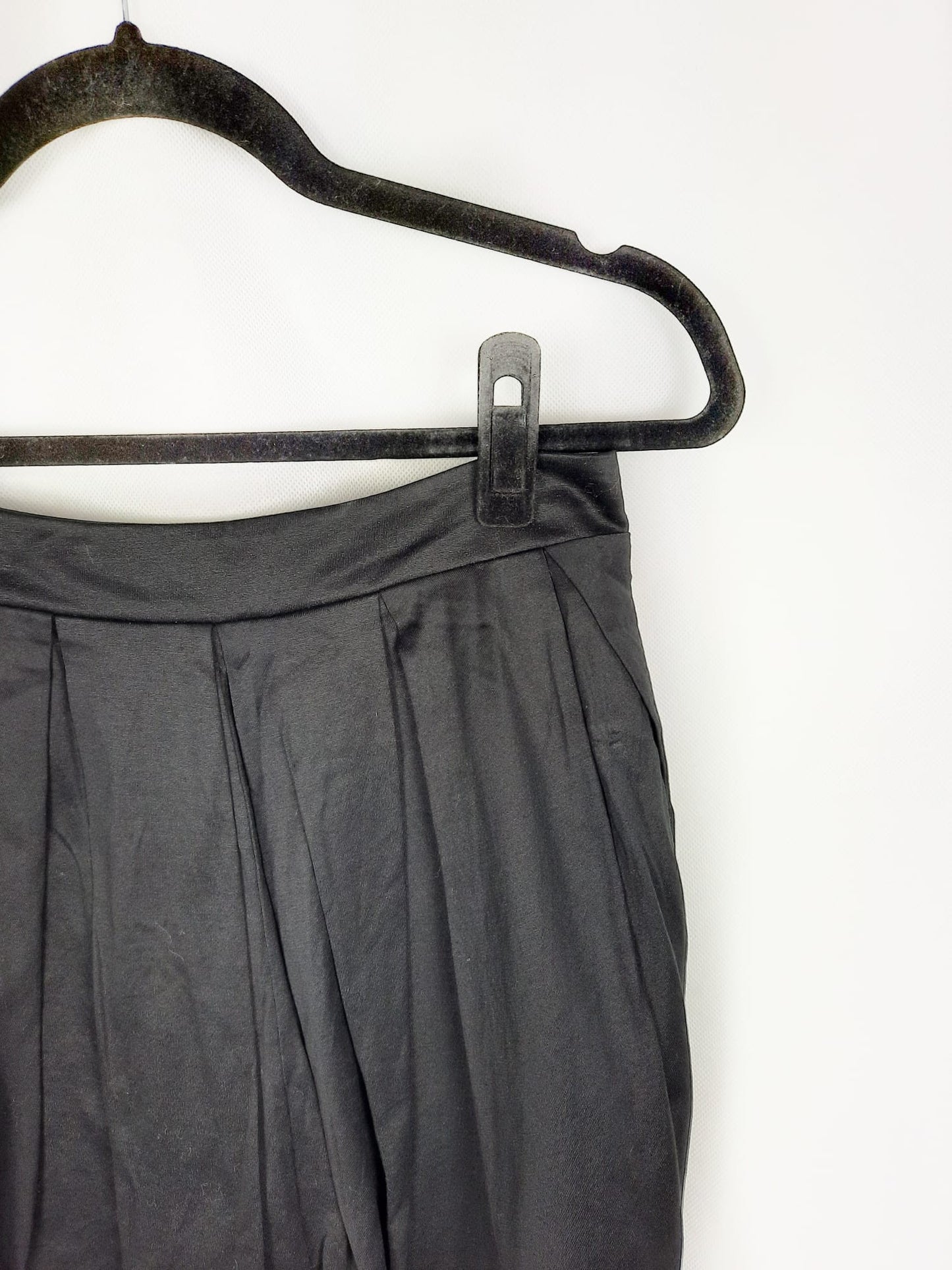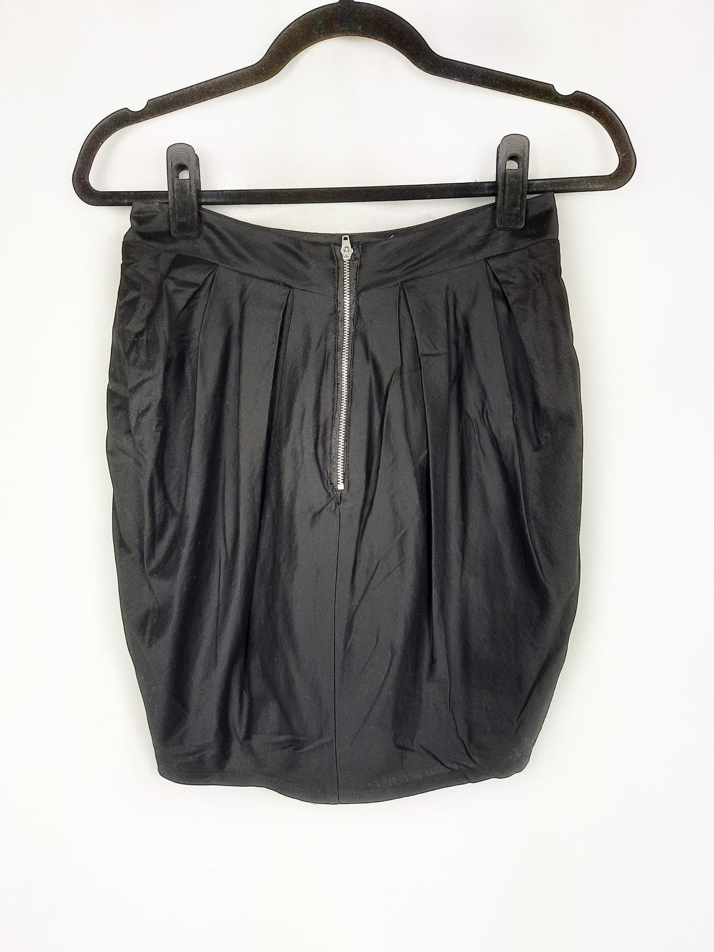 Falda negra plisada algo abomba. No es elástica y se abrocha con cremallera en la espalda. Cintura 36 cm, largo 41 cm