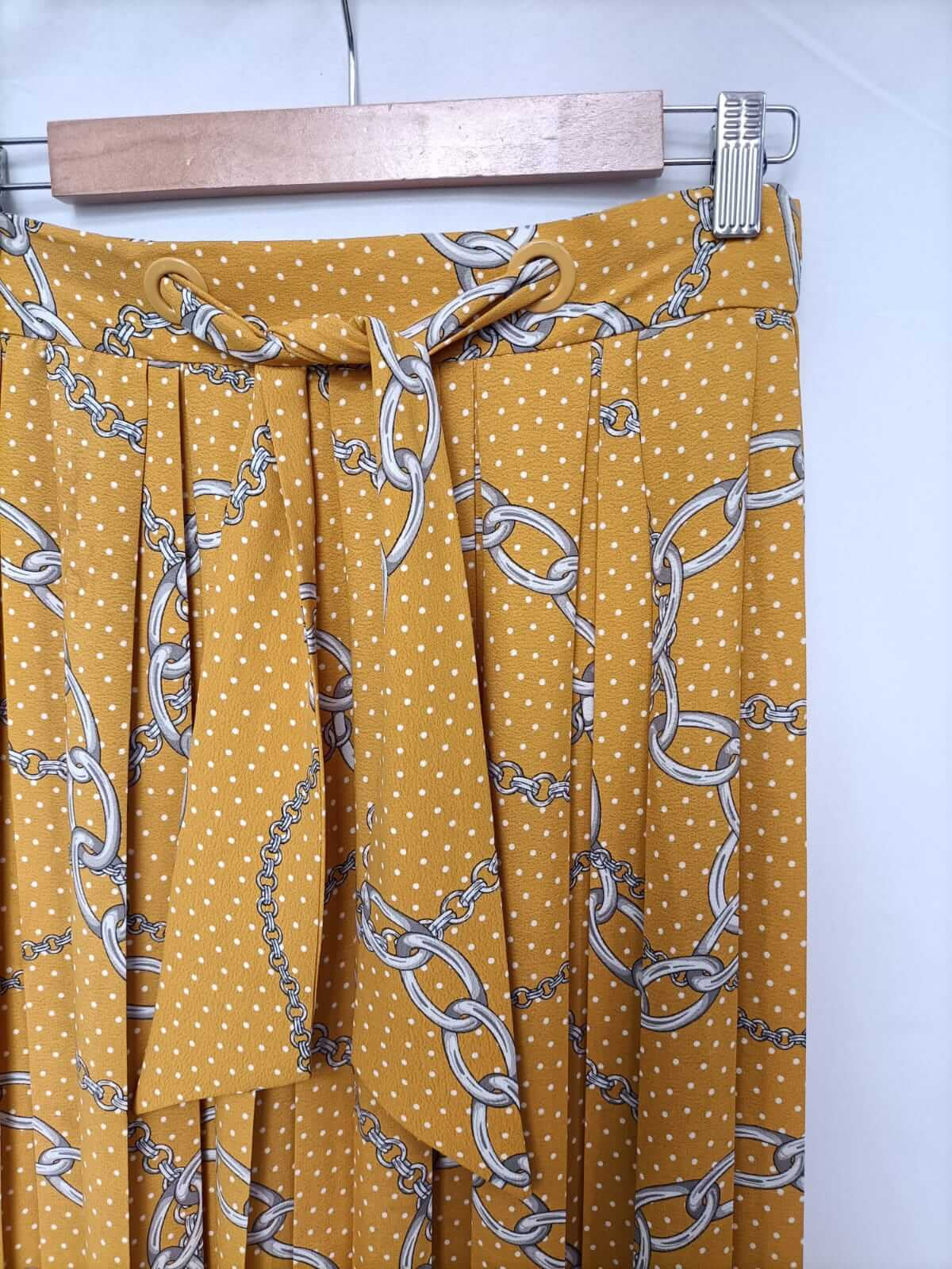 Mango. S. Falda midi plisada color mostaza con lunares blancos y cadenas. Fluida y fina. No elástico. Cintura 34 cm largo 74 cm