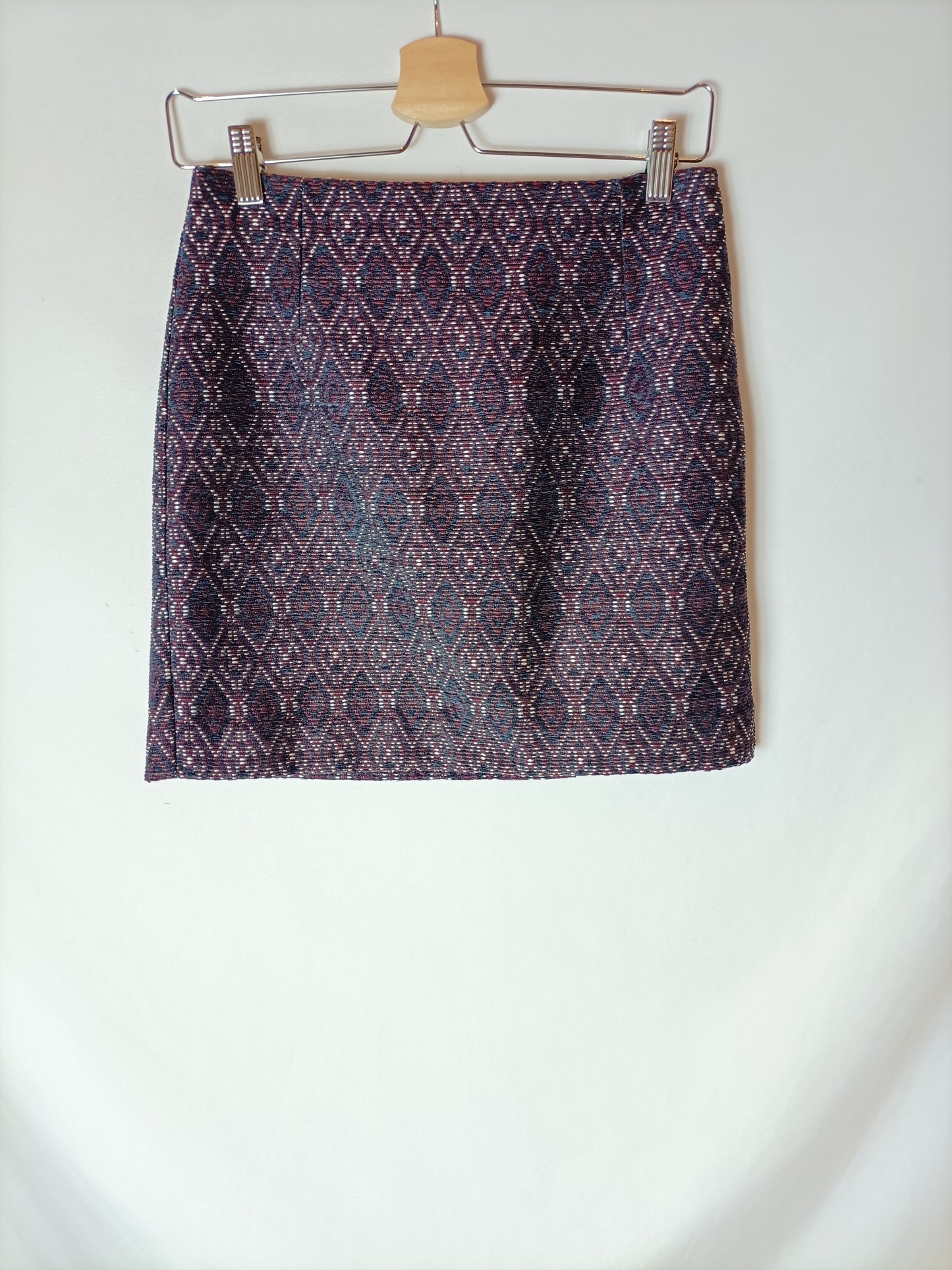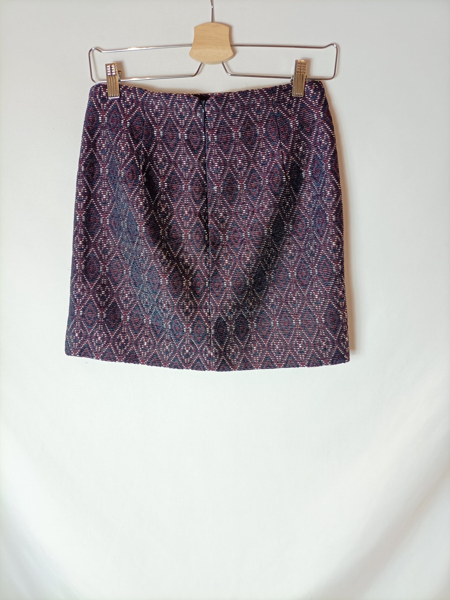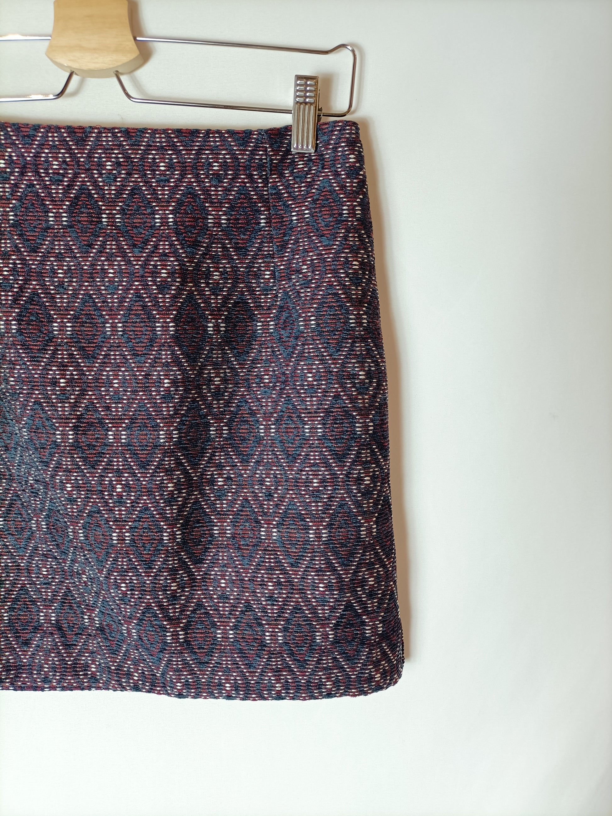 Falda textura estampado burdeos y azules. Tejido no elástico. Cintura 36 cm