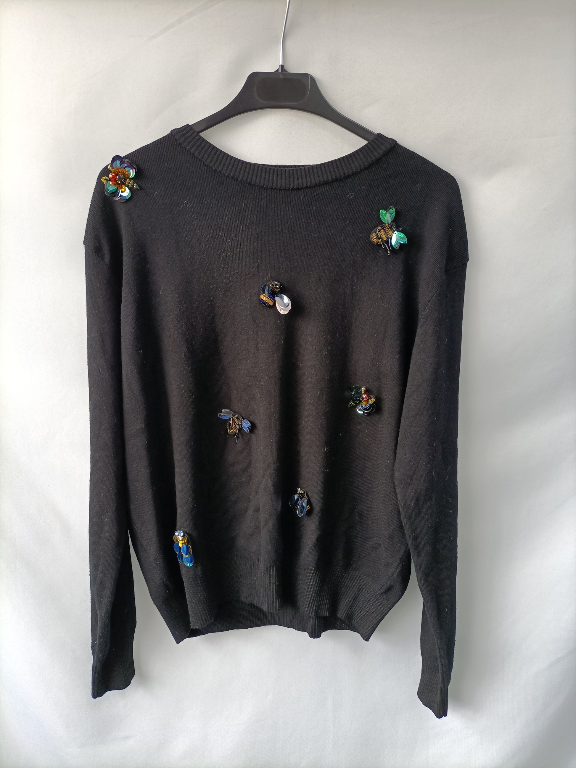 Mango. Jersey negro elastico y fluido con detalle de insectos en pedrería. Largo 54 cm