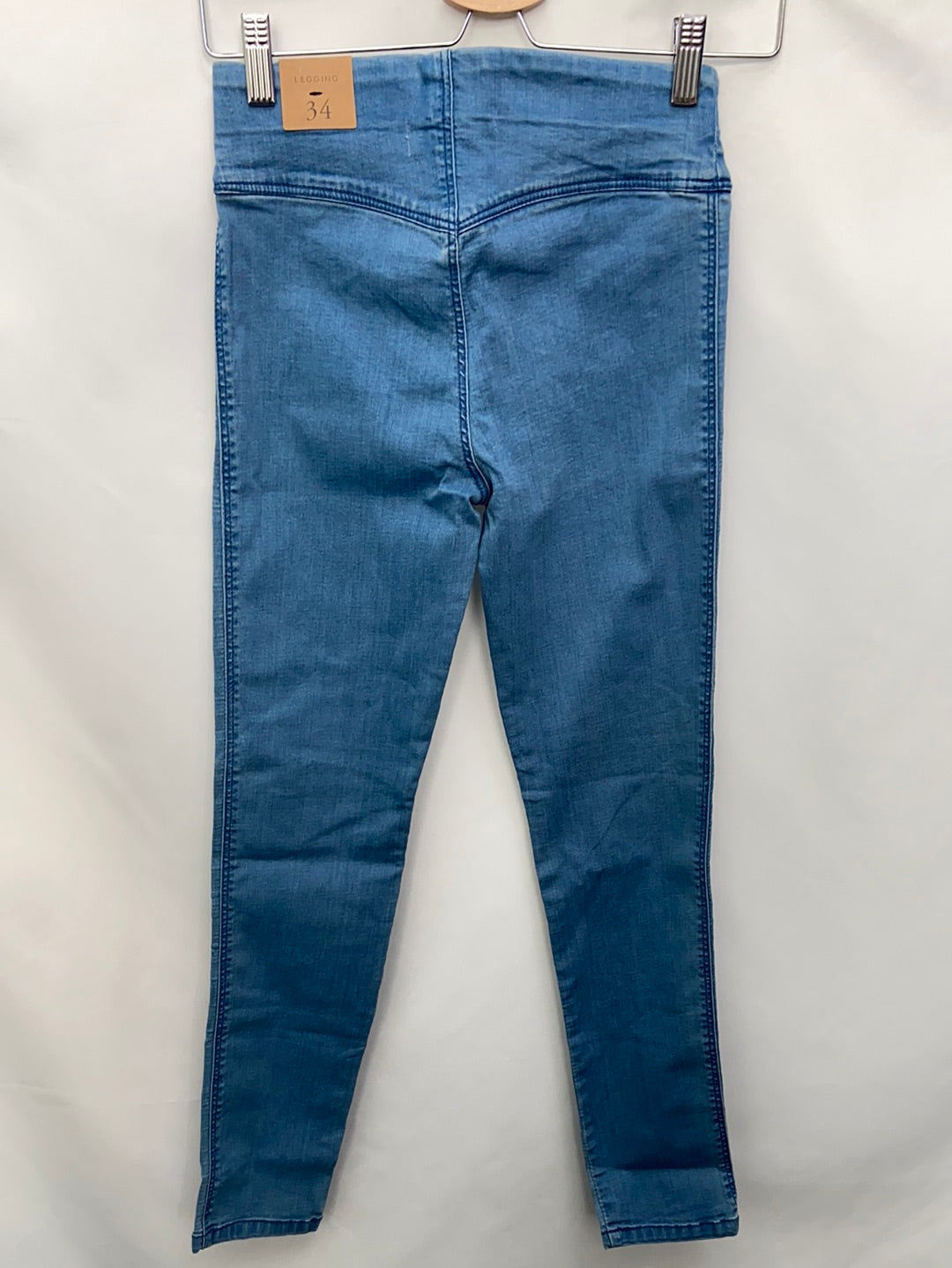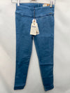 Leggin color vaquero clarito con cintura elásticas, de tejido vaquero, no tiene botón. cintura 32 cm, largo 86 cm