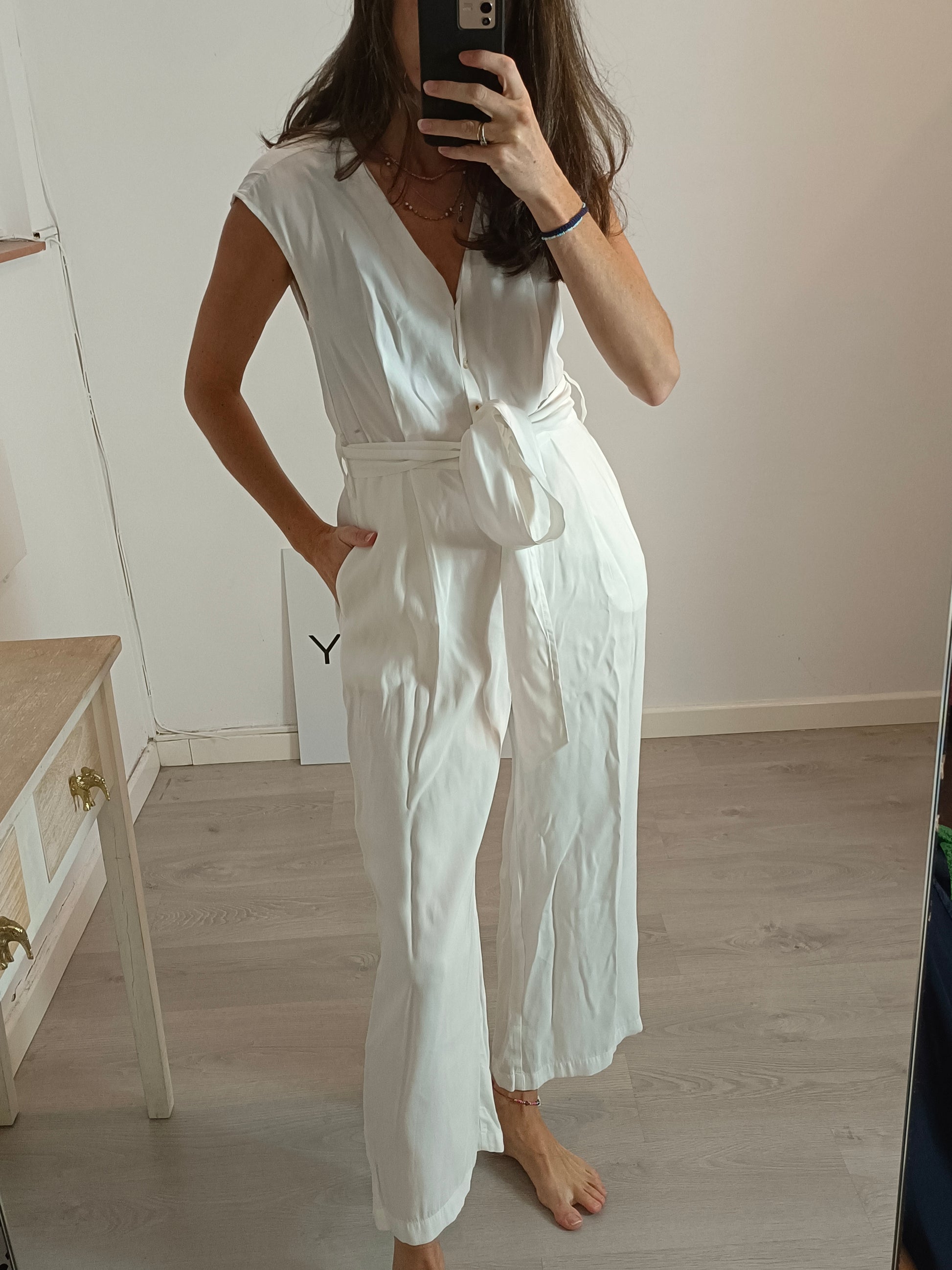 Mono fluido blanco con la parte de arriba abotonada y con lazada.