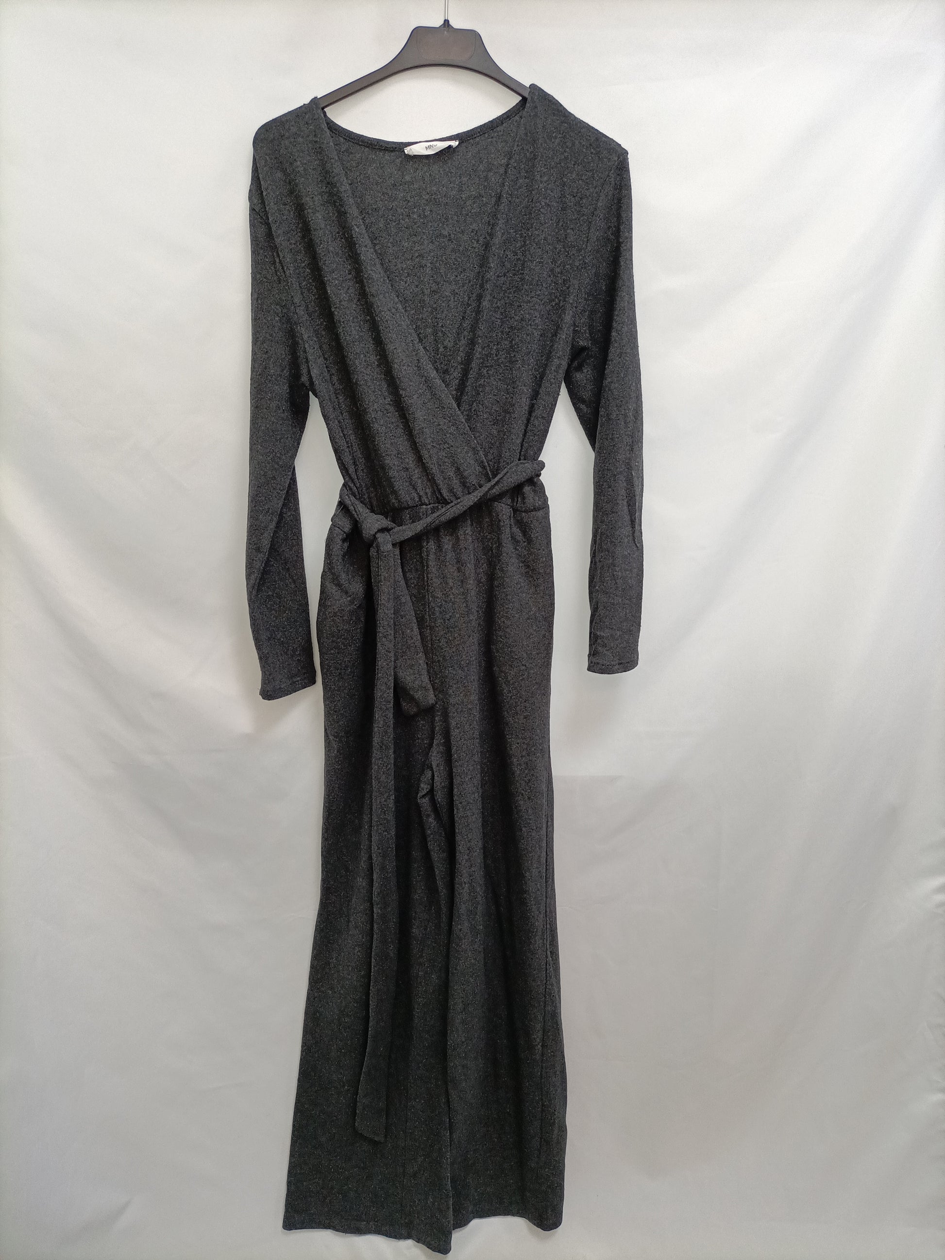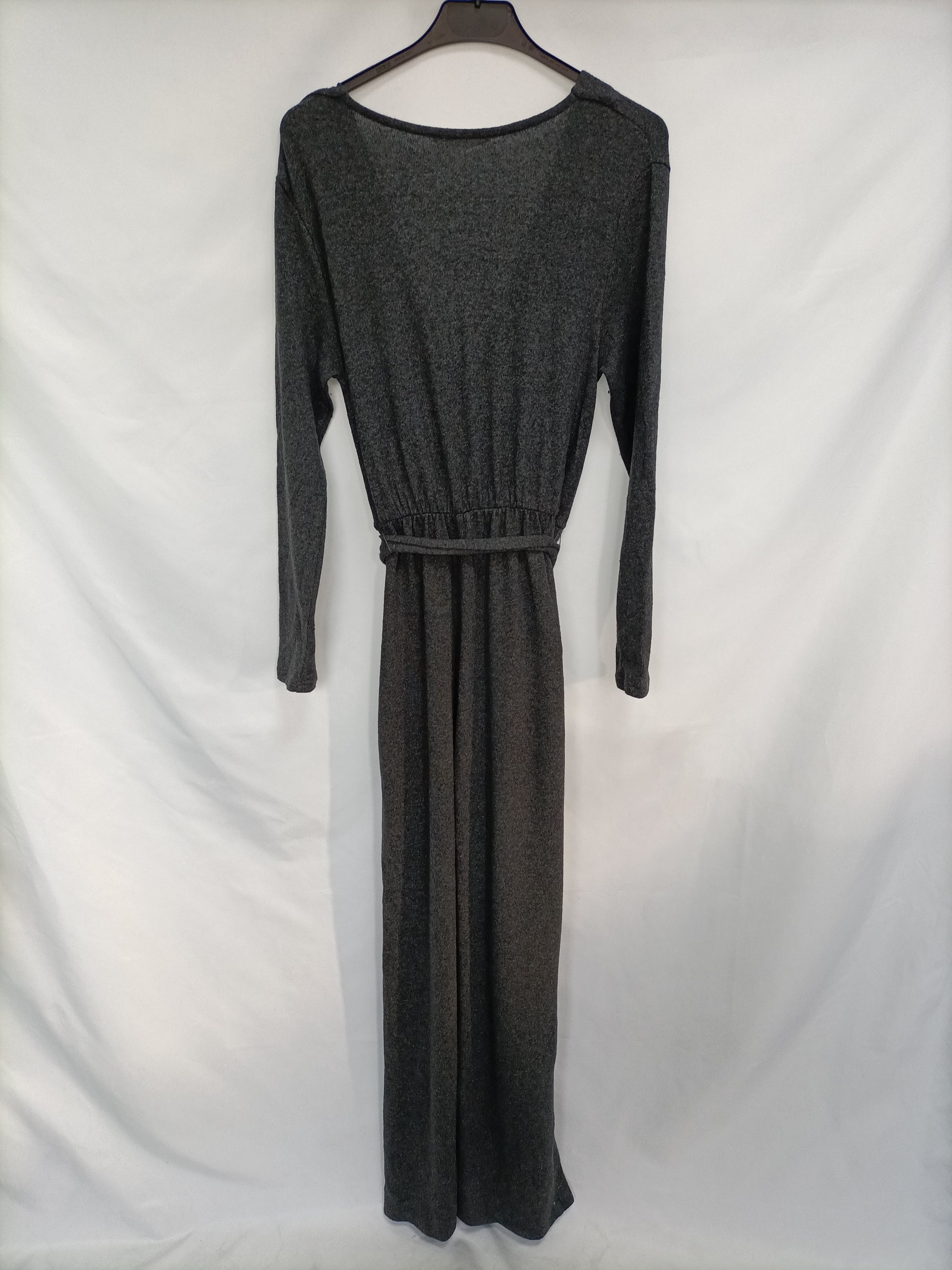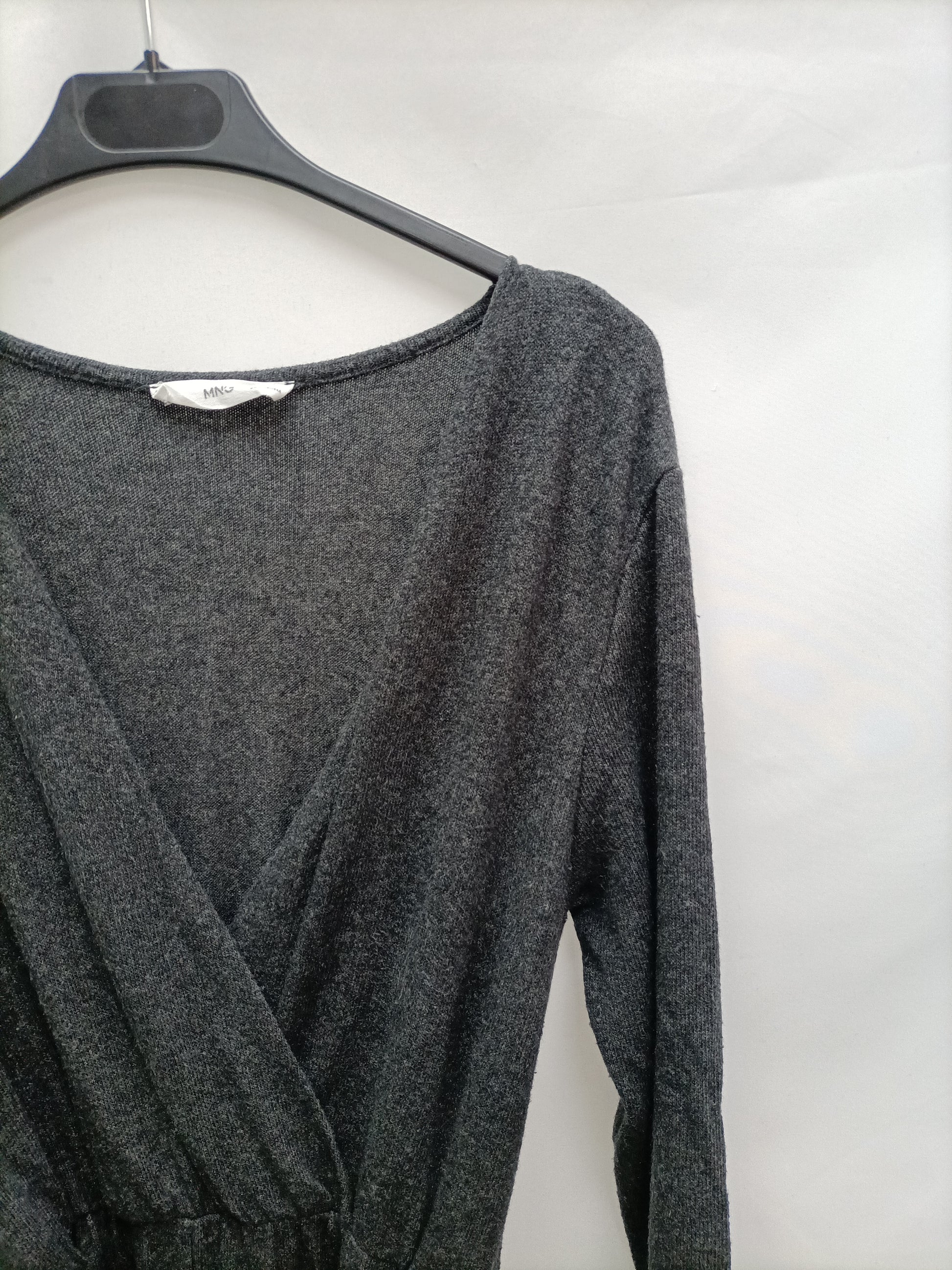 Mono de punto gris, elástico manga larga con escote cruzado y cinturón.. Largo 150 cm