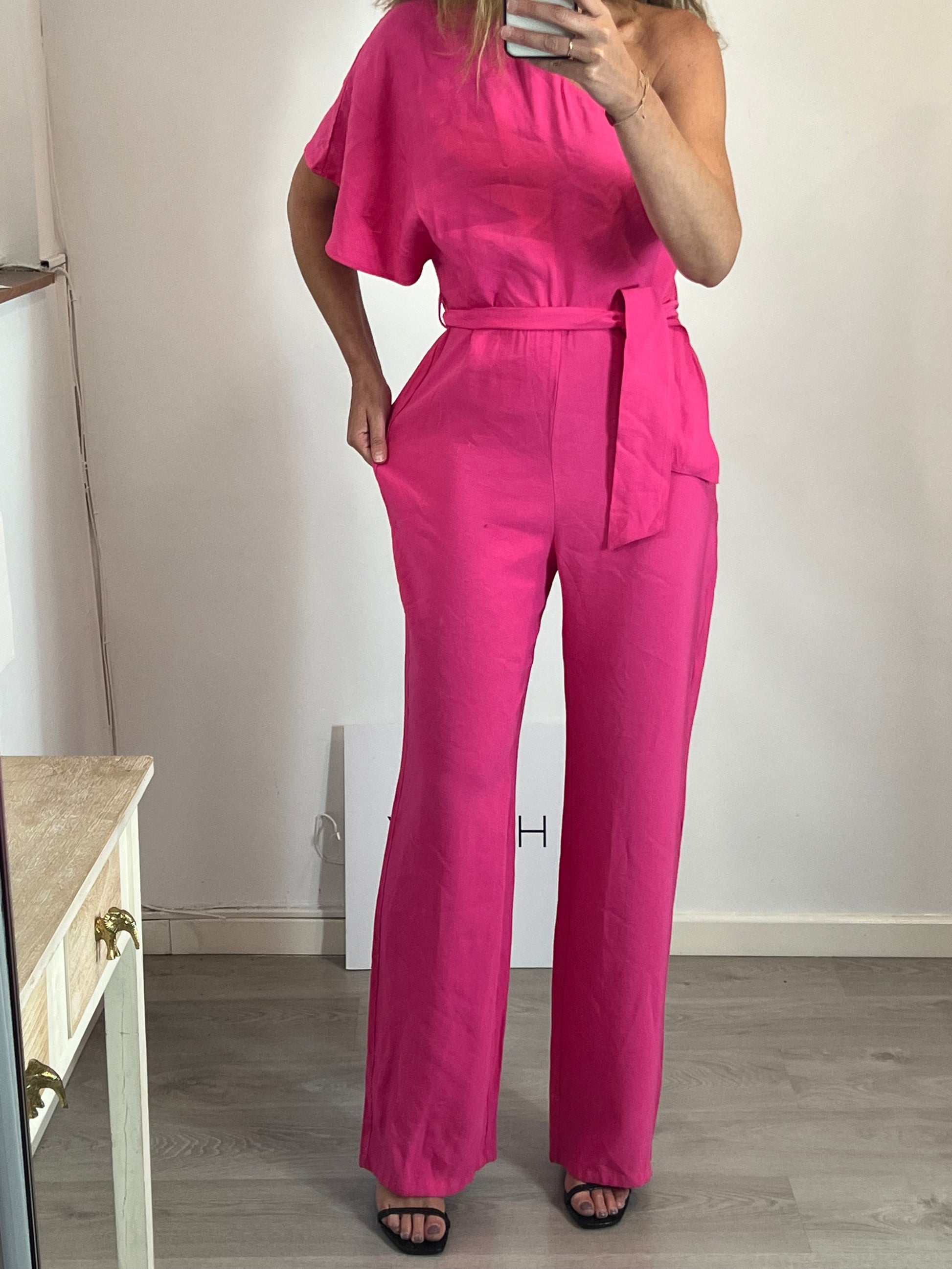 NUEVO CON ETIQUETA. Mono largo palazzo rosa fucsia. Cintura 40 cm, largo desde la cintura 115 cm