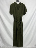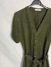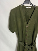 Mono largo verde pata ancha y abotonado. Tara: zona de los botones con alguna marca de plancha