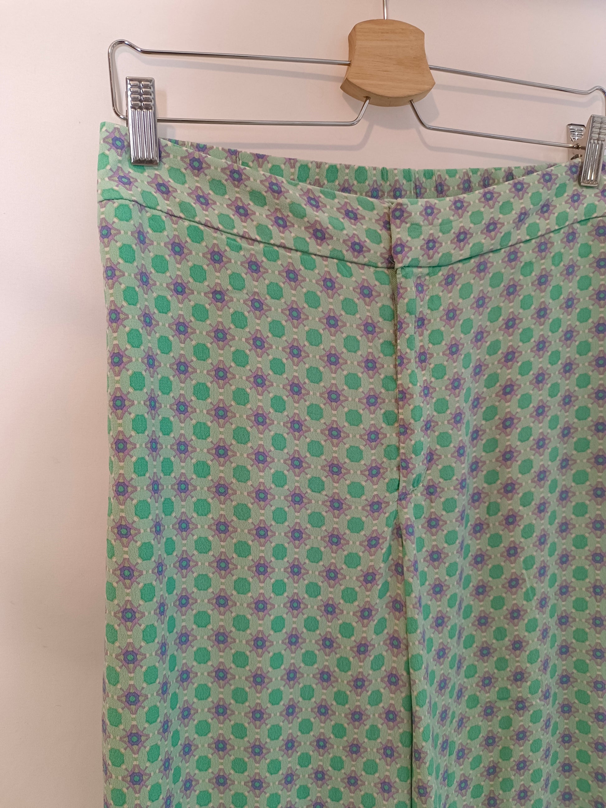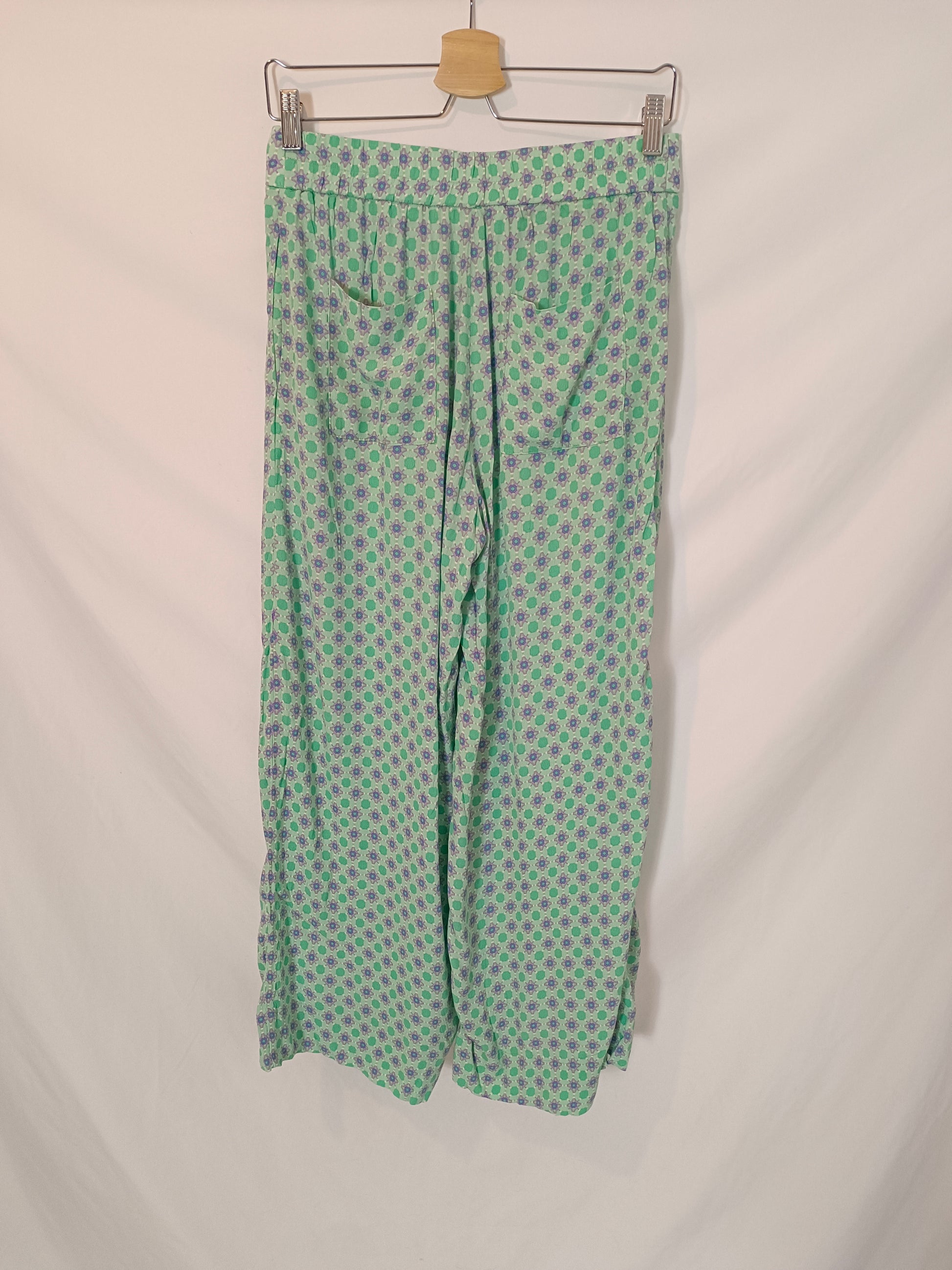 Pantalón verde claro fluido y estampado. cintura 36 cm