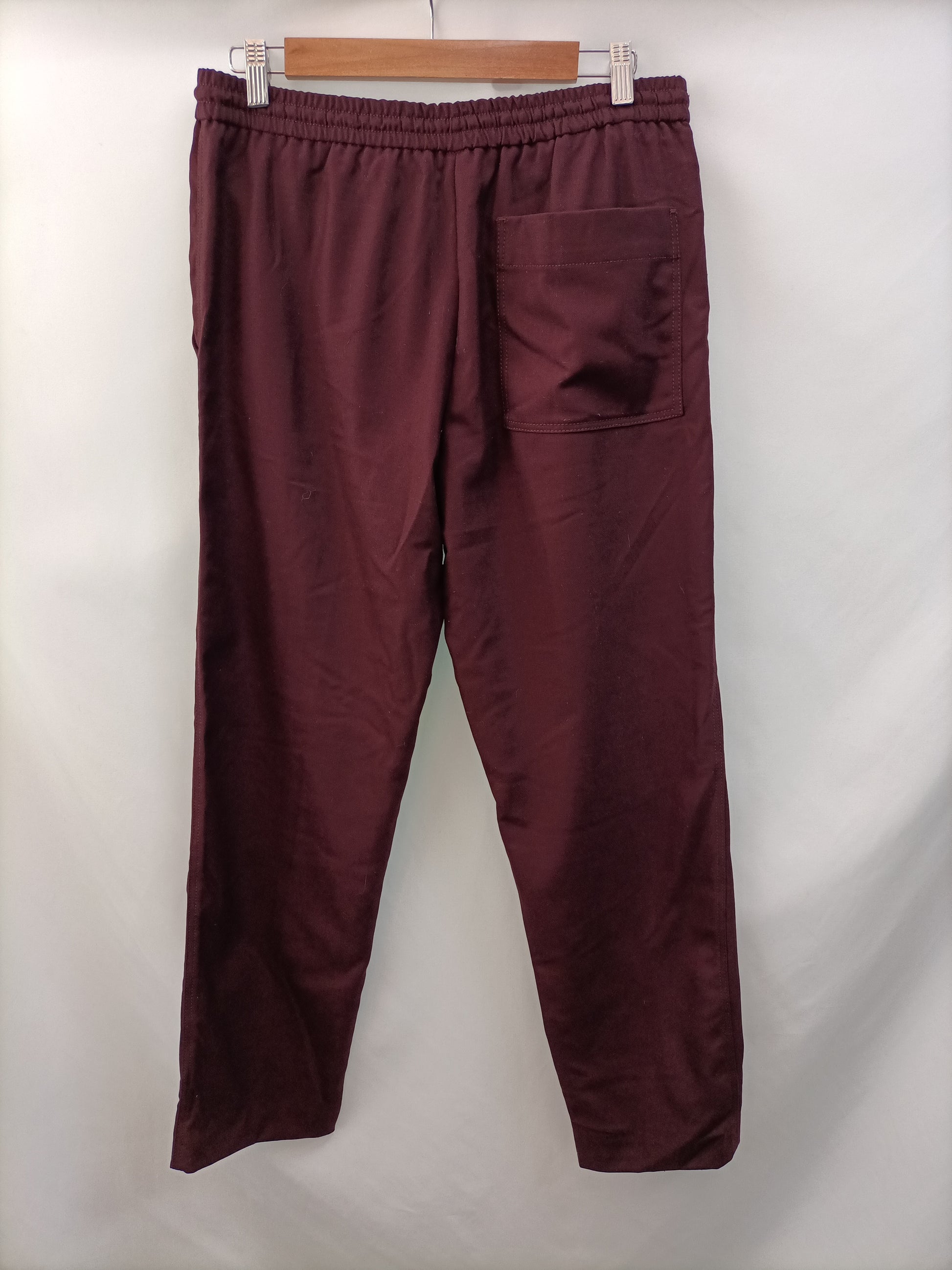 Mango. Pantalones burdeos fluidos. Cintira elástica ajustable con cuerda. Largo 96 cm
