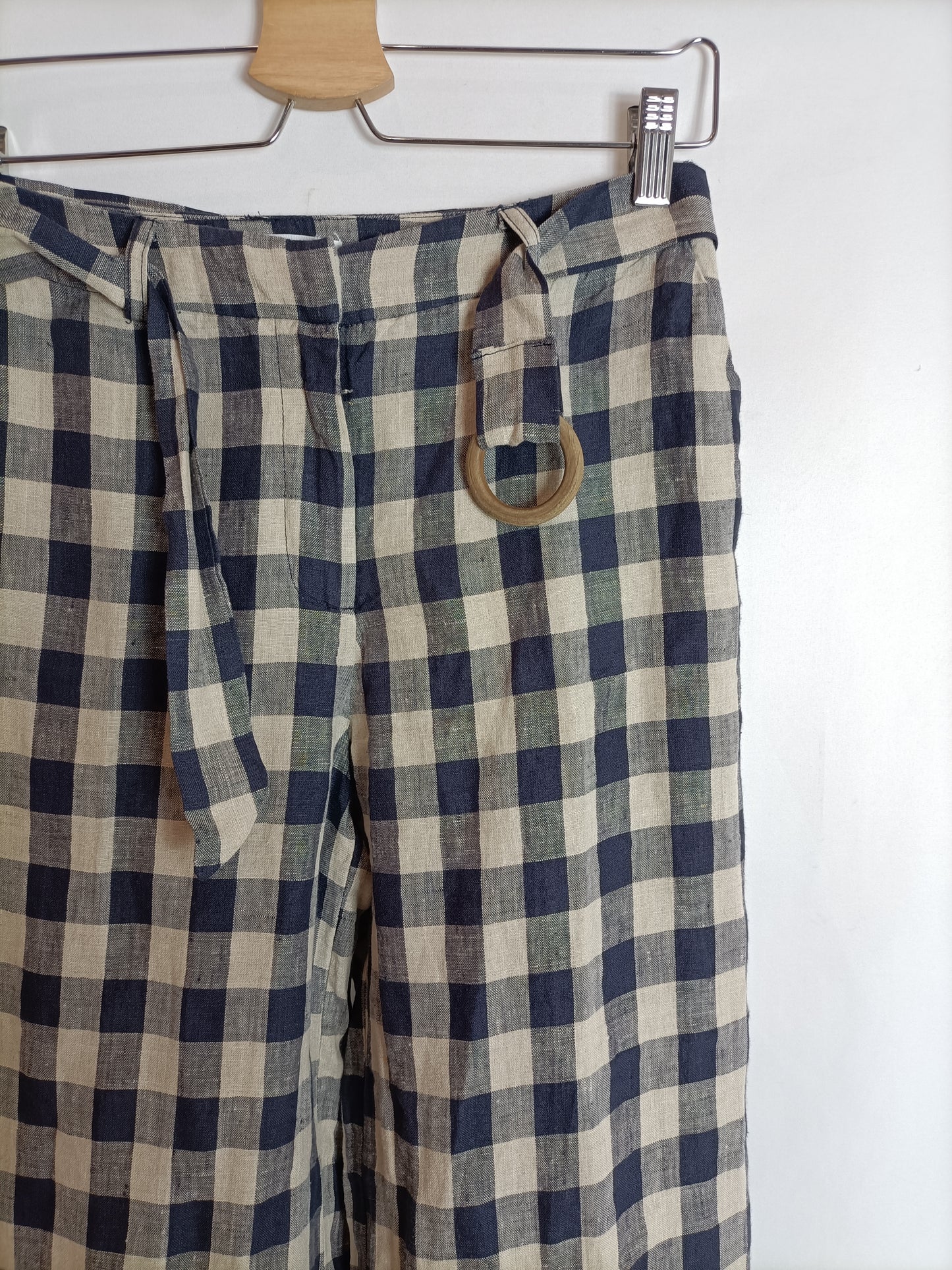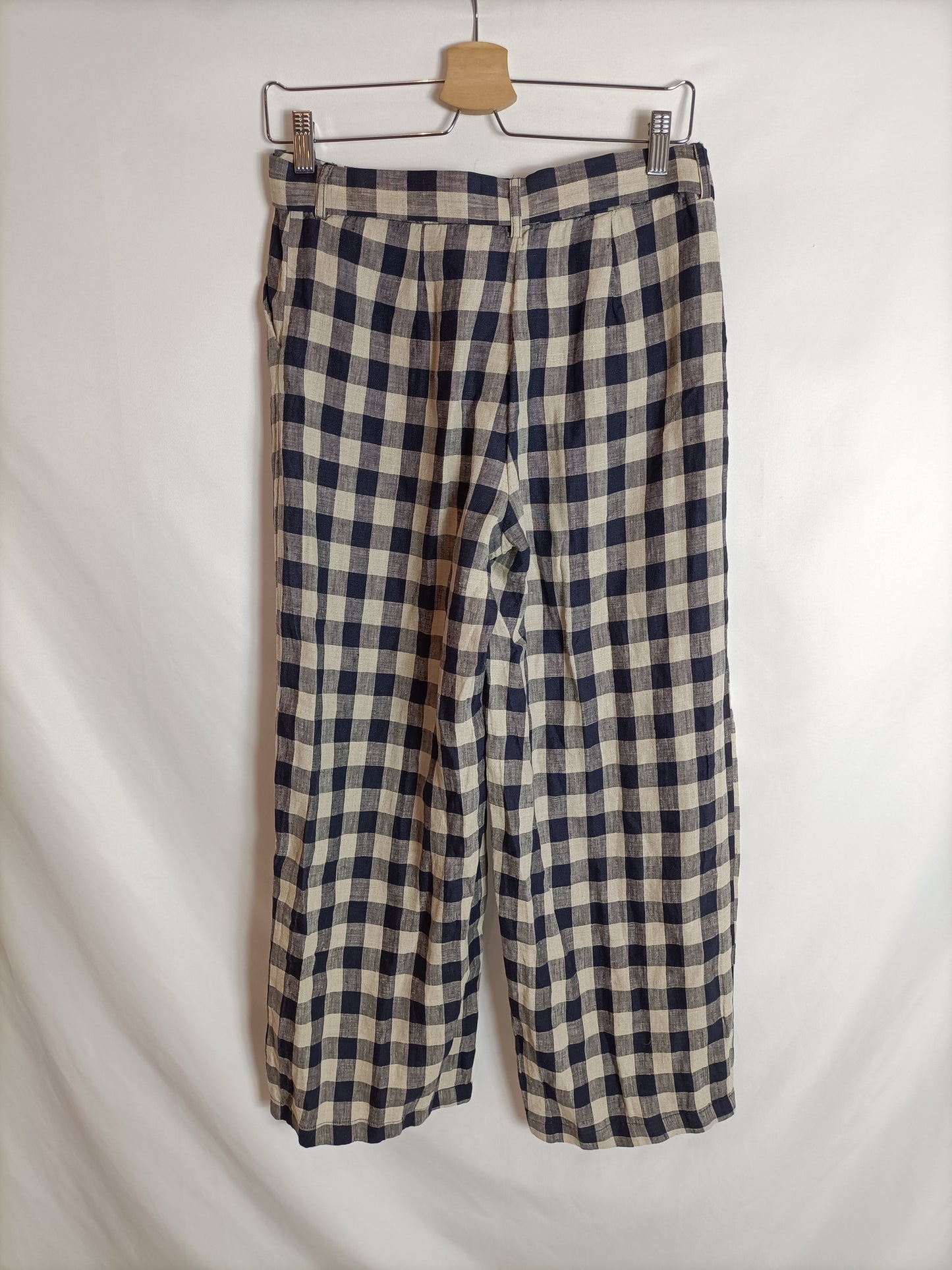 Pantalón fluido de cuadros beige y azul con cinturón, Por el tejido parece lino