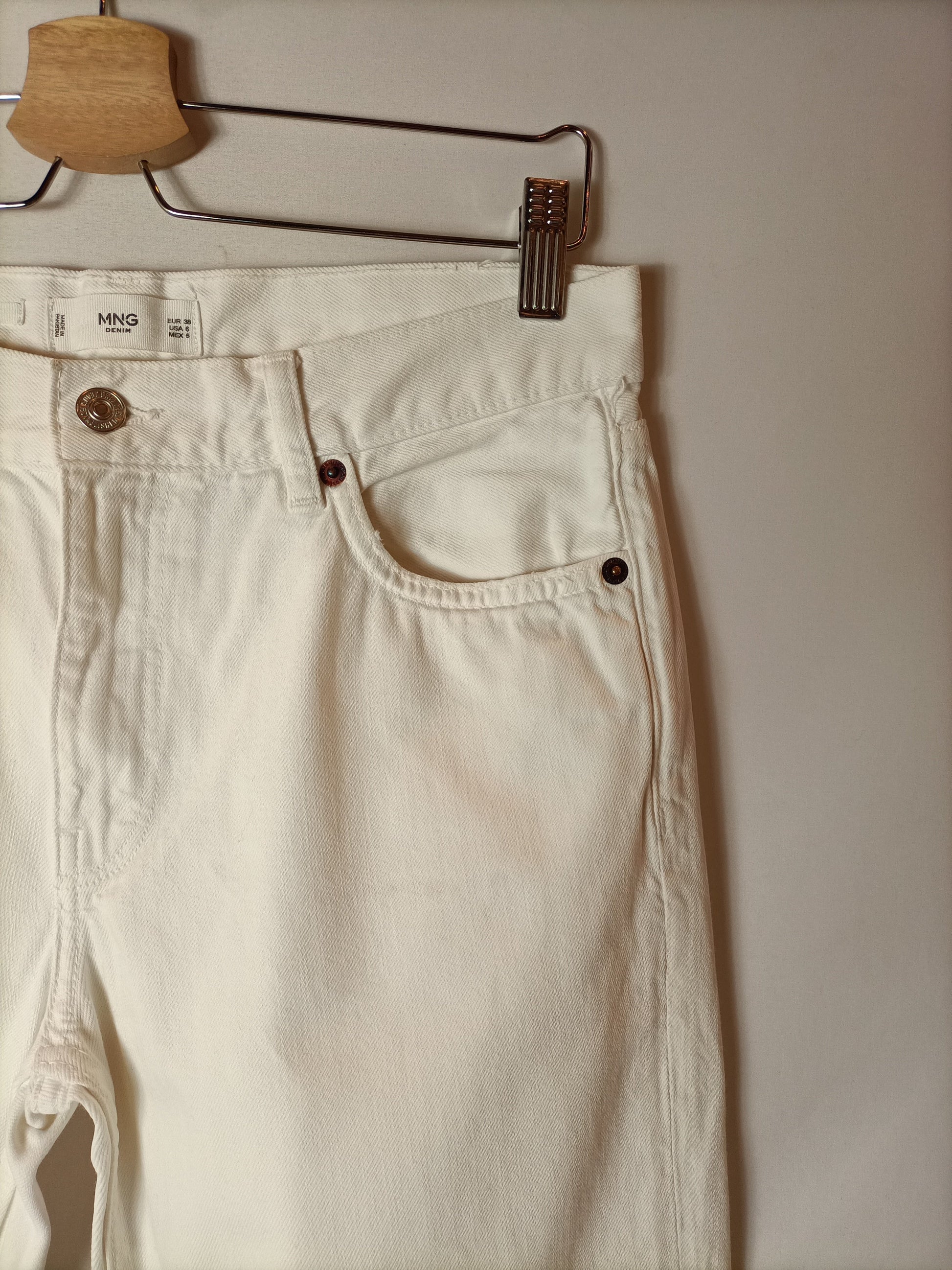 Pantalón denim estilo mom fit desflecado. Tejido no elástico. Cintura 40 cm