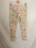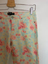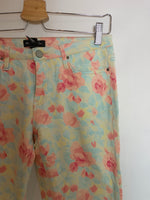 pantalón de flores rosas y azules de tejido denim. cintura 36 cm