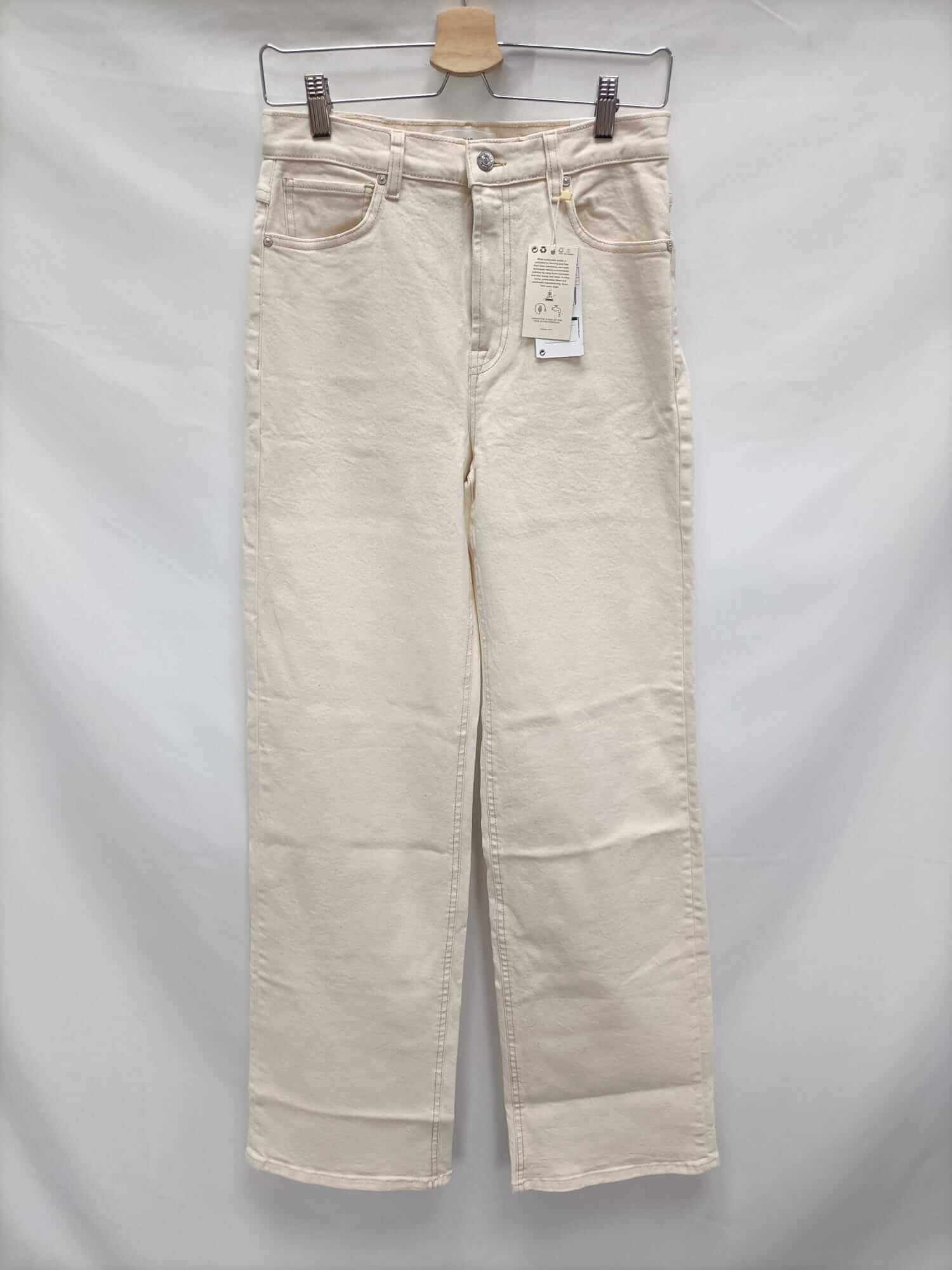 NUEVO CON ETIQUETA. Pantalón beige ancho estilo wide leg de tejido tipo denim. No elástico. Cintura 36 cm largo 117 cm