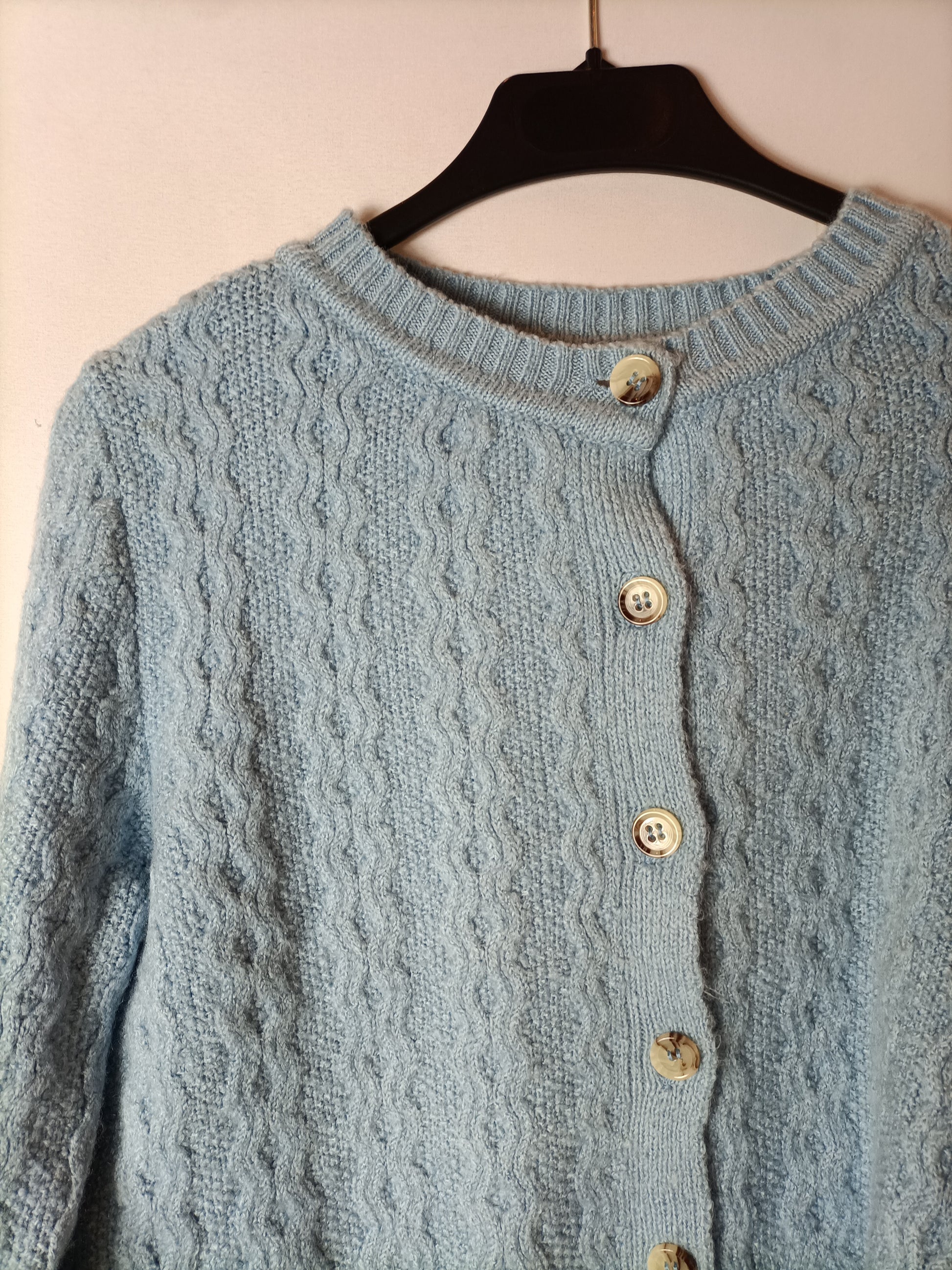 Rebeca azul claro abotonada.