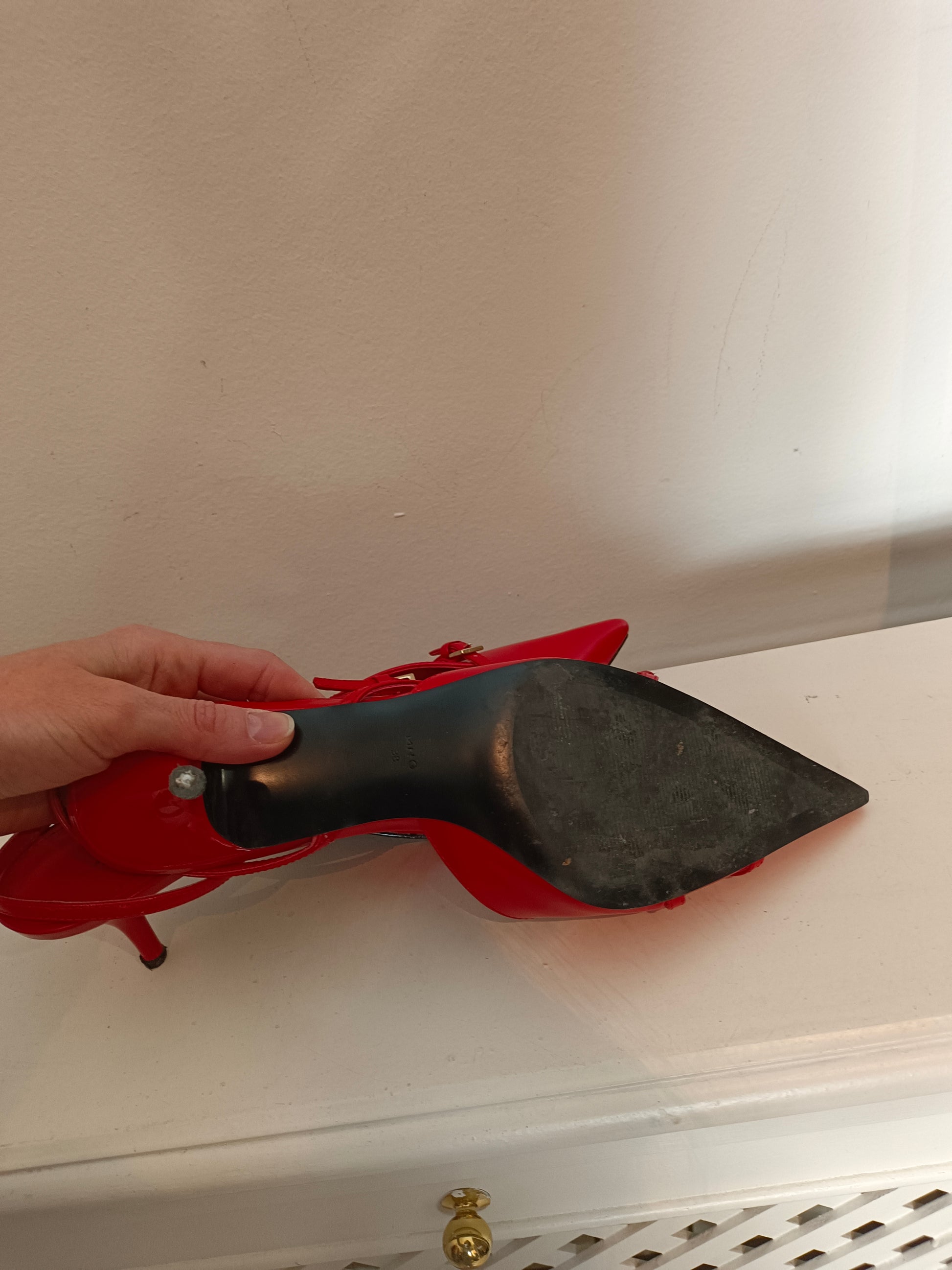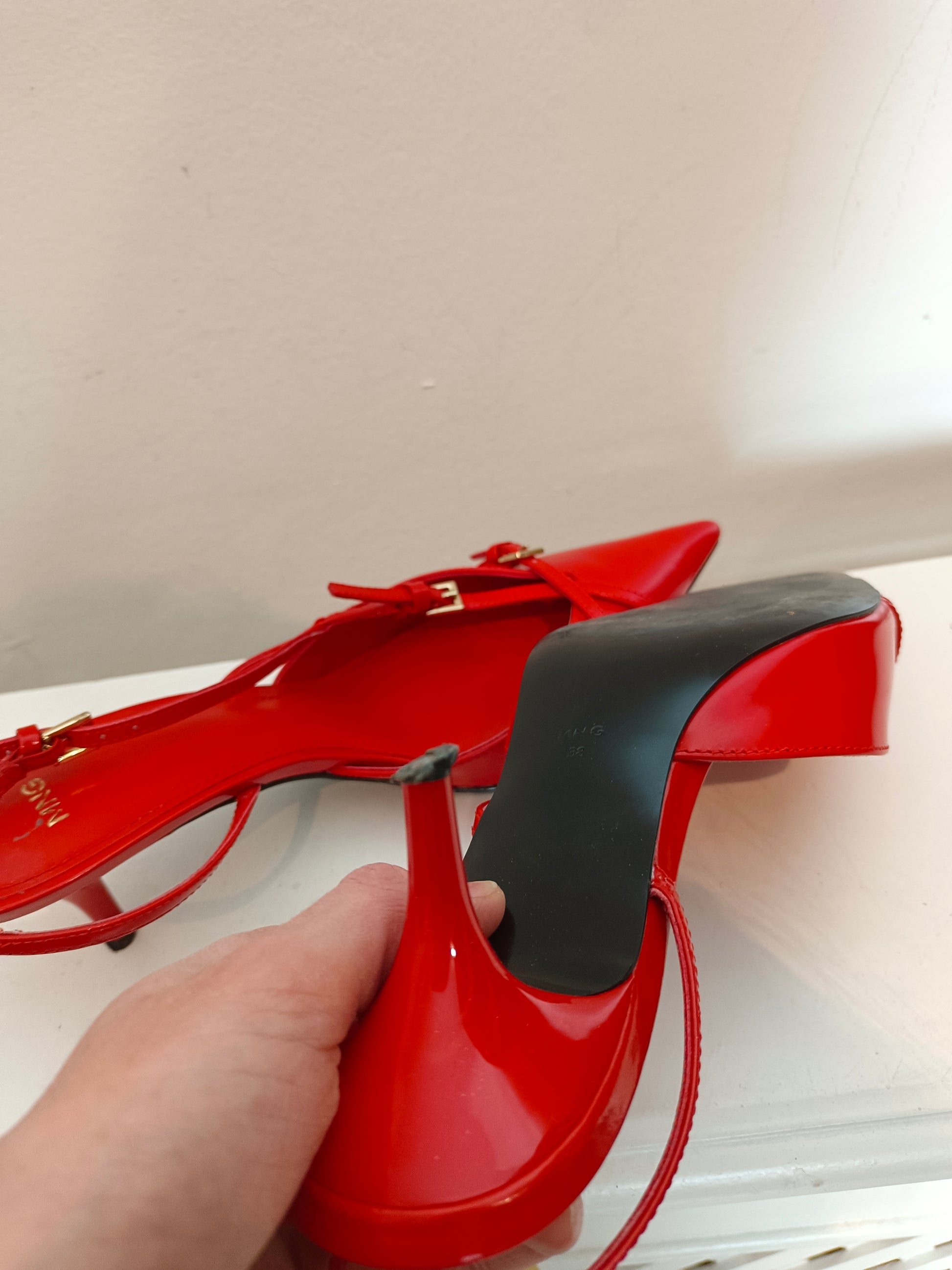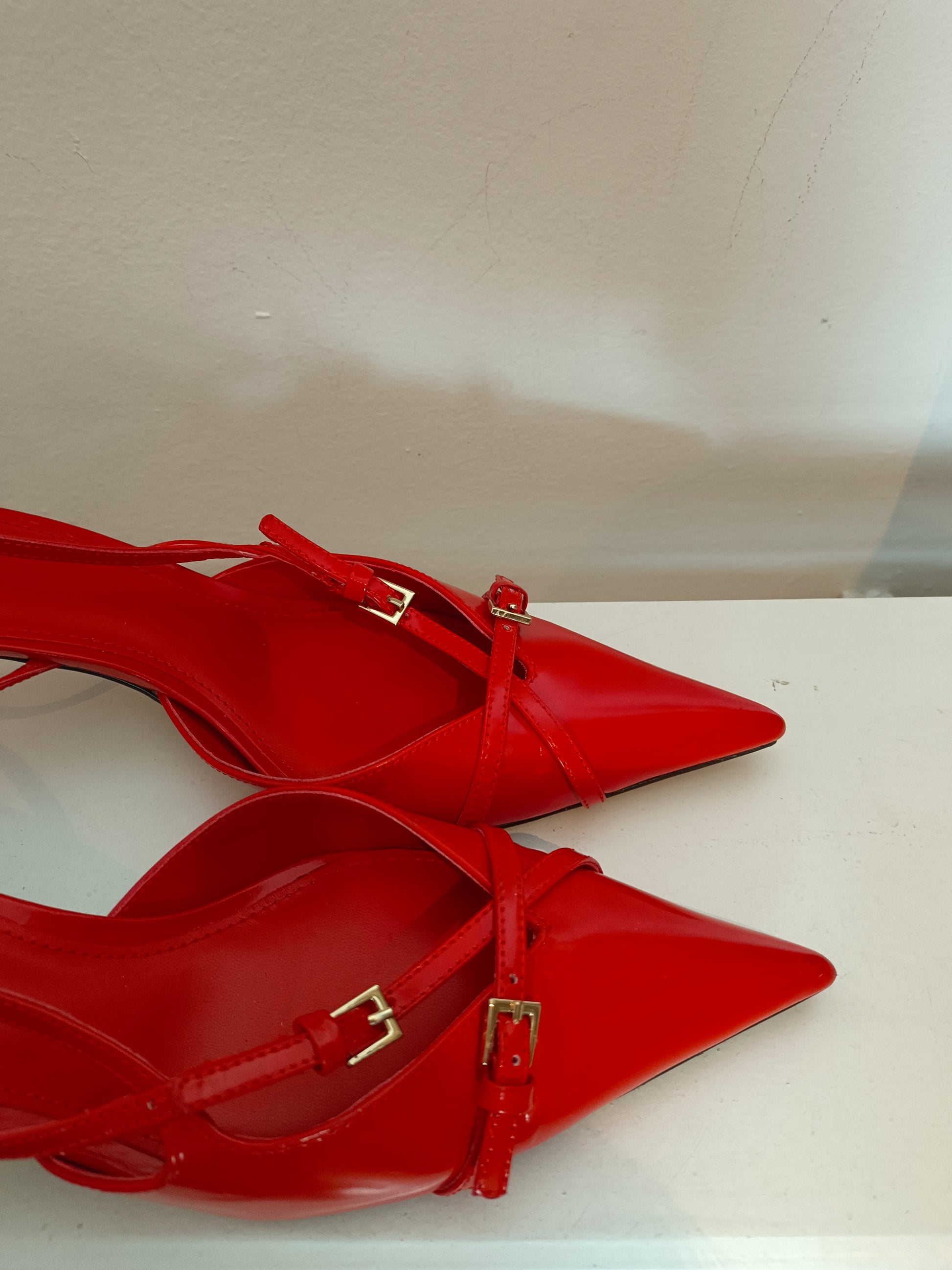 Zapatos rojos de mango con hebillas. Tiene las tapas desgastadas. Tara: tapas de los tacones desgastadas