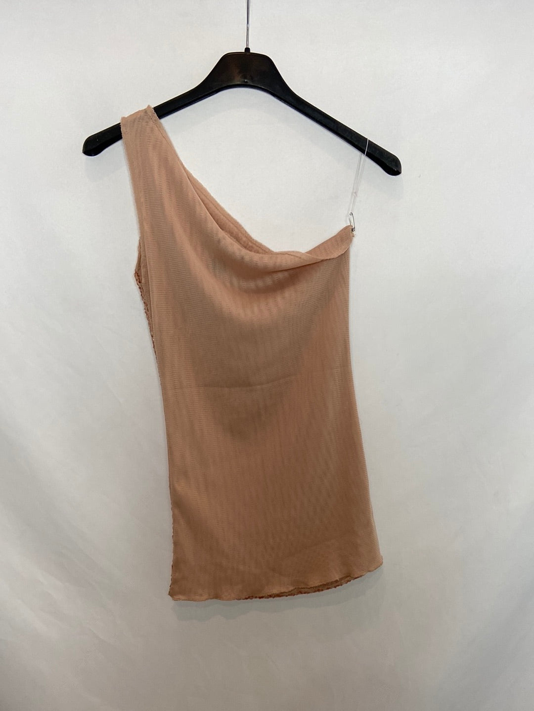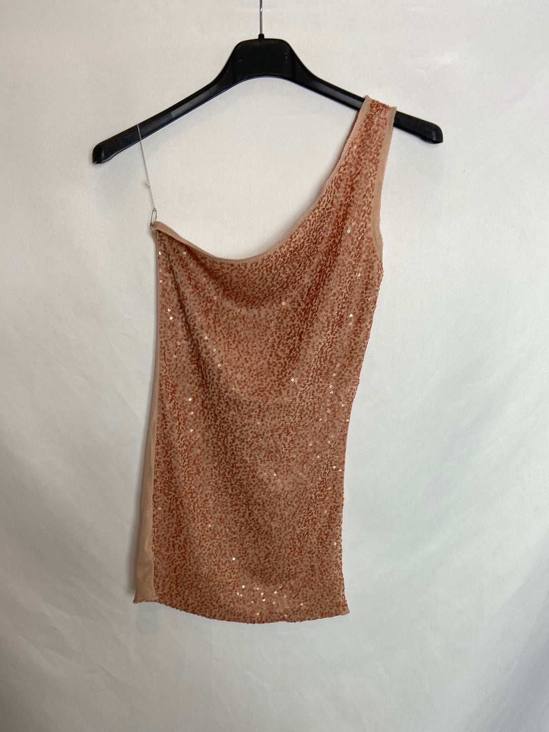 Top asimétrico rosa con lentejuelas de una sola manga.