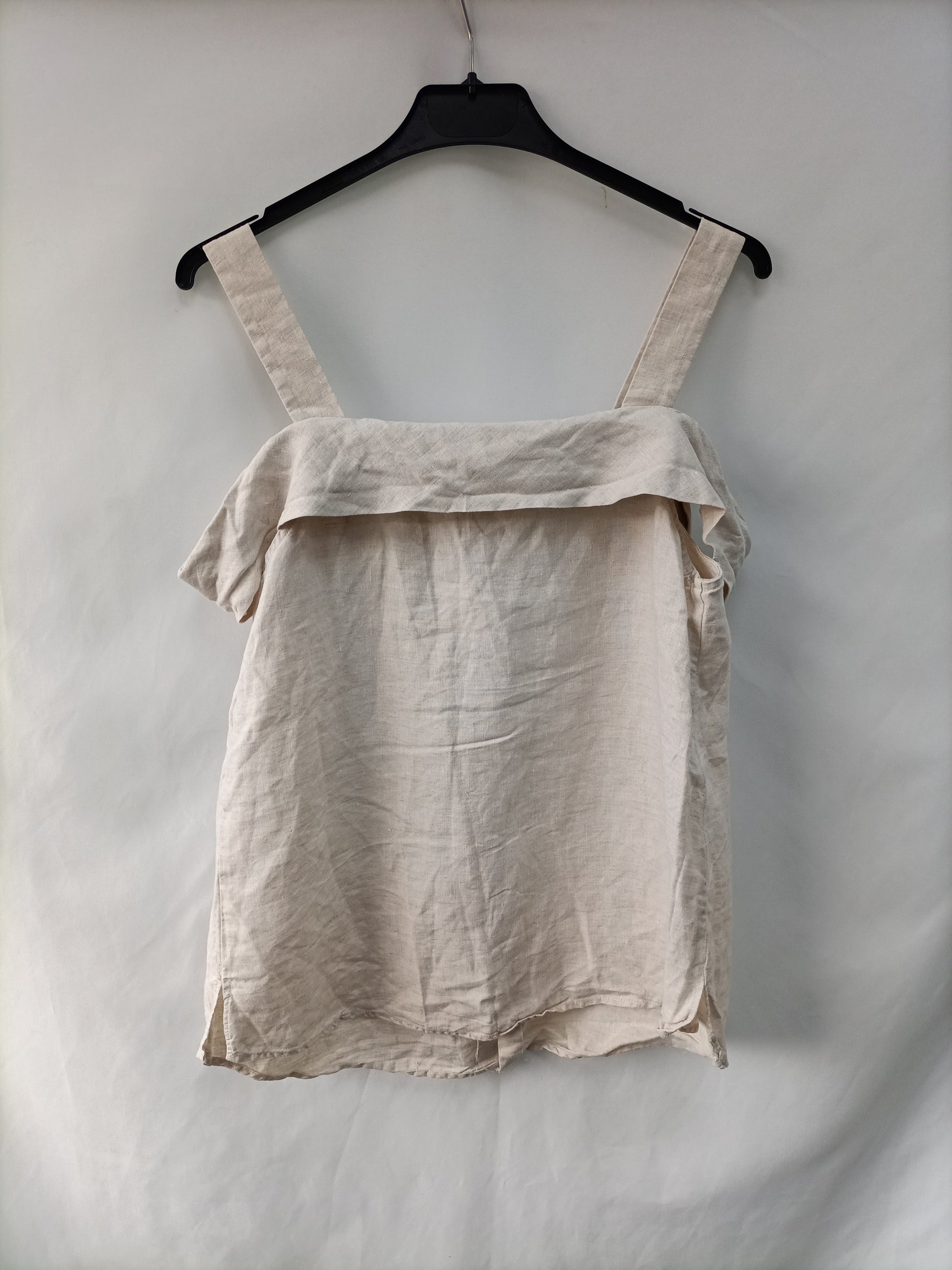 Top beige de tejido de lino con mangas y hombros descubiertos.