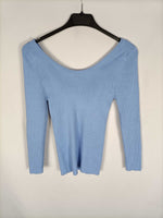 Mango. M. Top celeste de punto de canalé ajustado y elástico. Largo 57 cm
