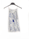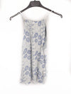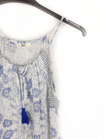 Top blanco con floree azules, es fluido y con escote fruncido. Sisa amplia. Largo 65 cm