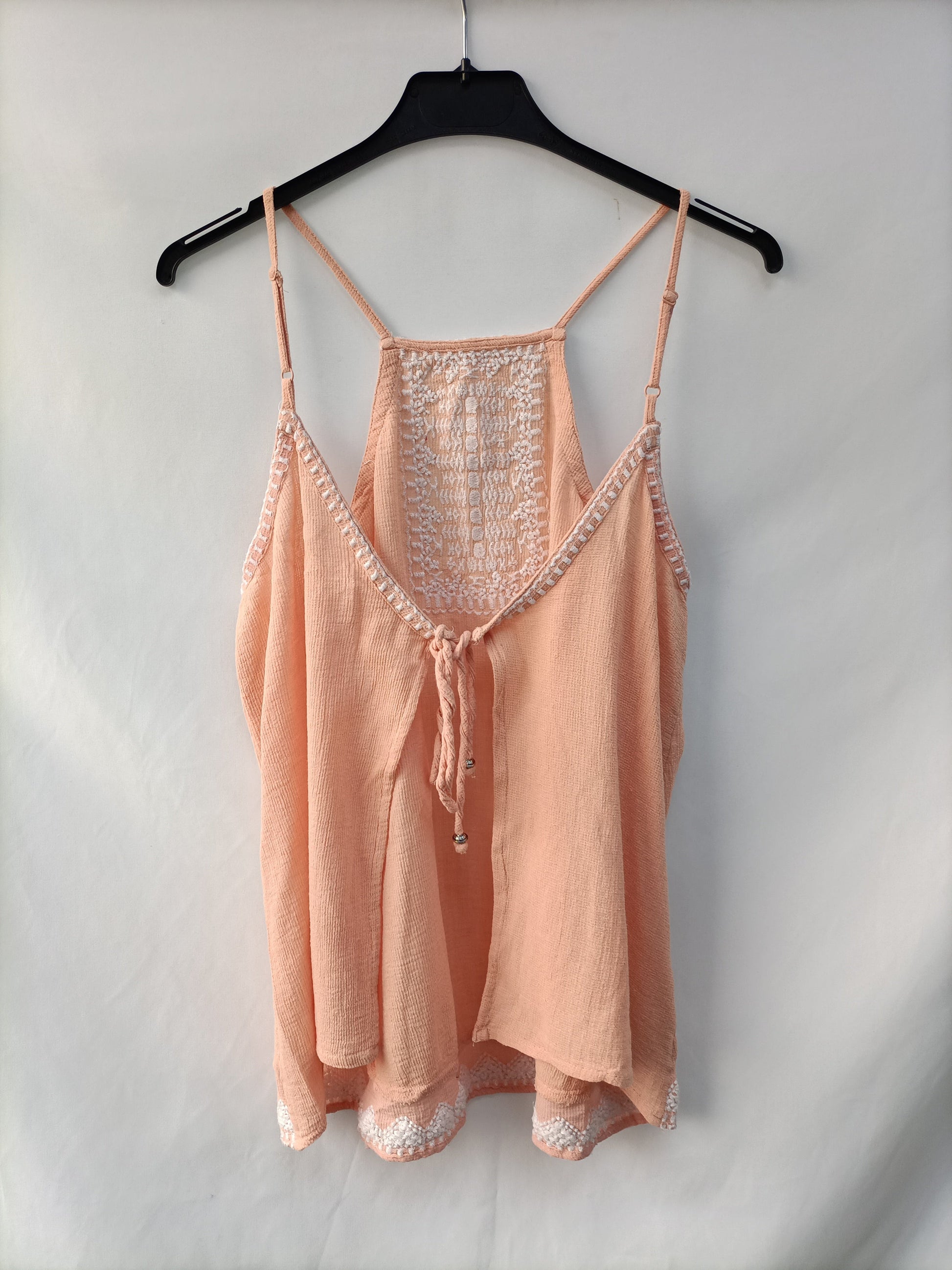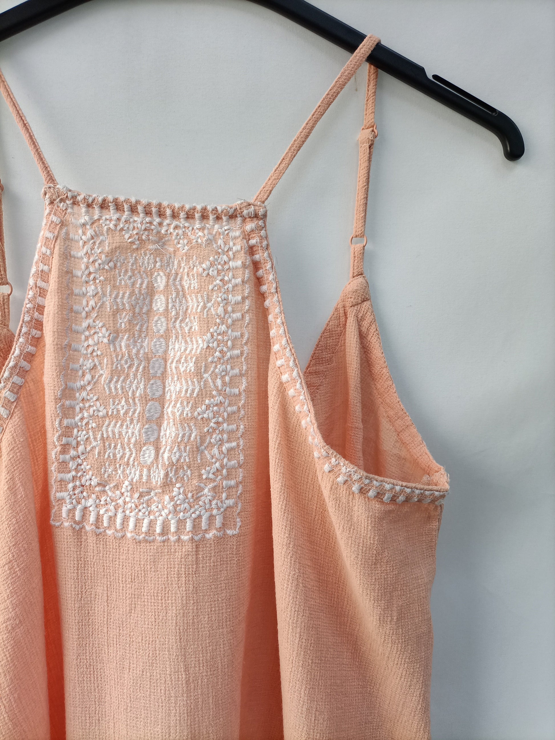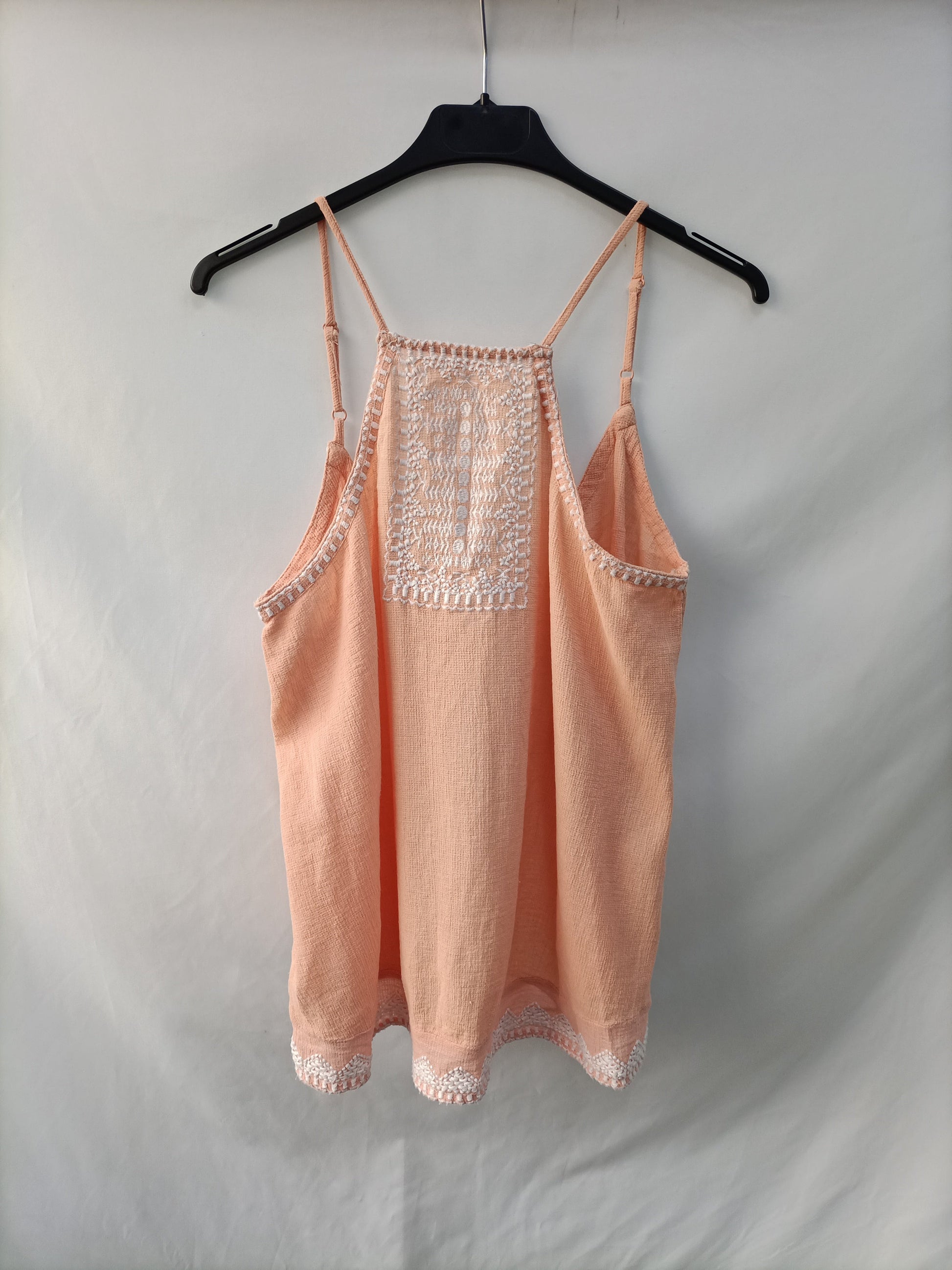 Top salmón con detalles bordados en blanco. Escote halter. Espalda abierta. De sisa a sisa 48 cm Largo 58 cm