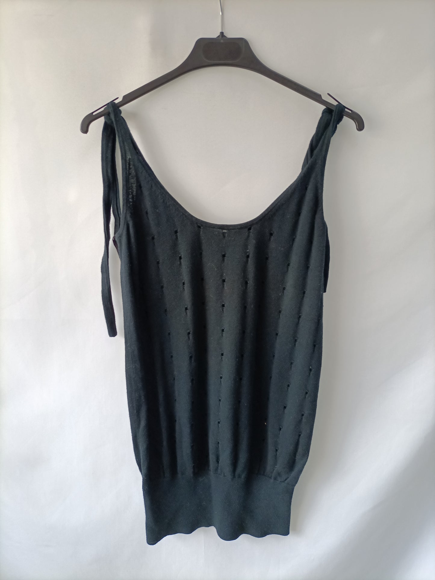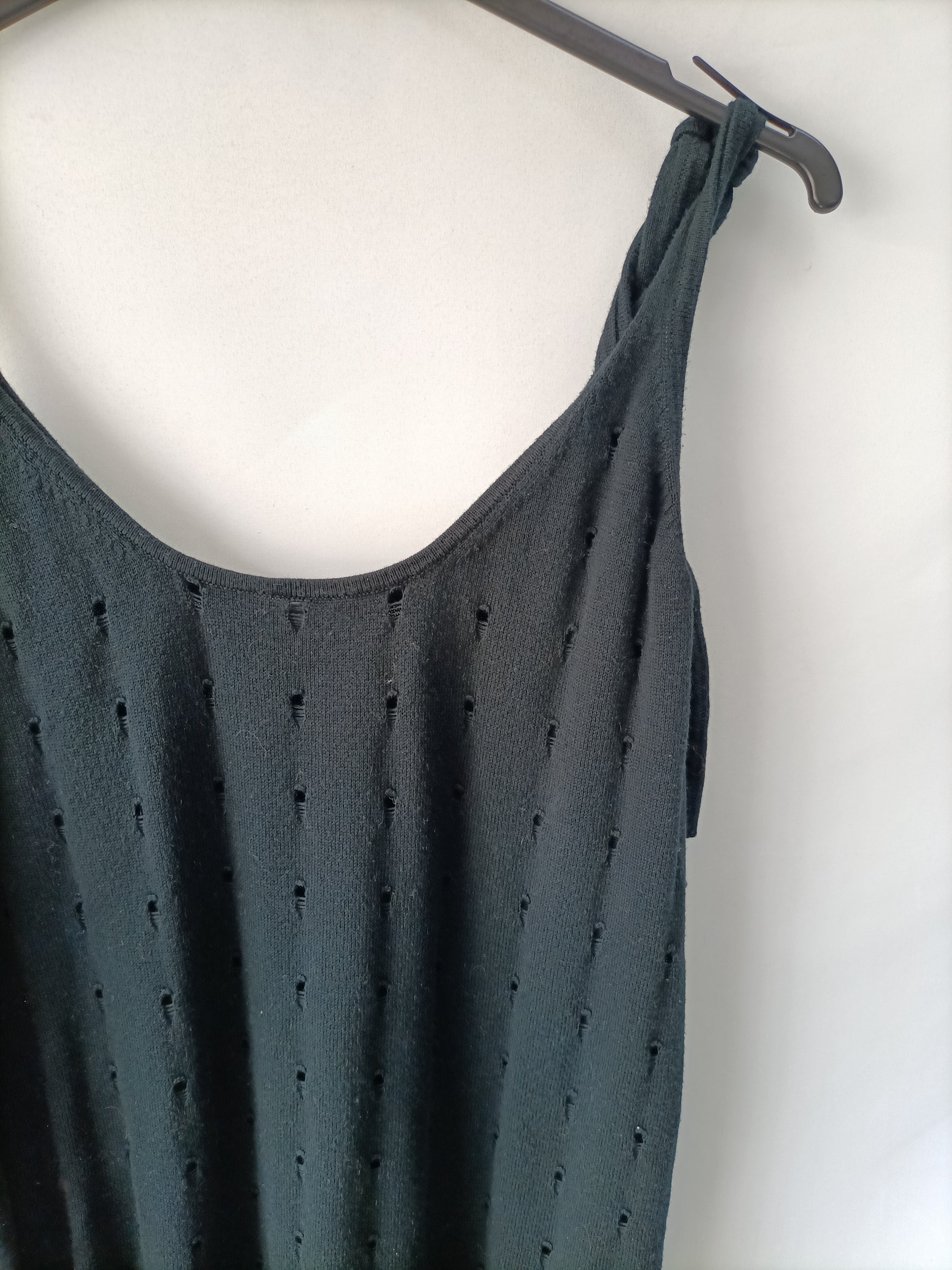Top negro troquelado con tirantes ajustables con lazada es de punto. Mas ajustado en la cintura y elástico . Largo 67 cm