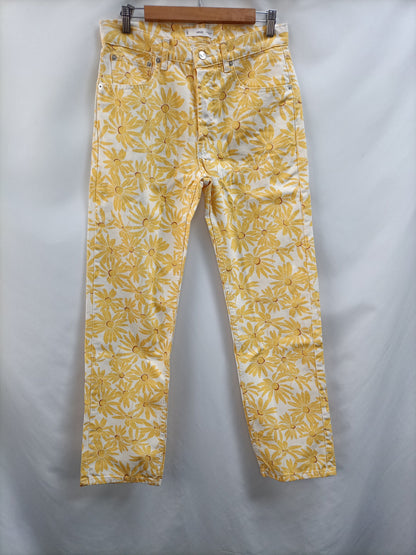 Pantalones tejido denim con flores amarillas. Cintura 39 cm largo 105 cm