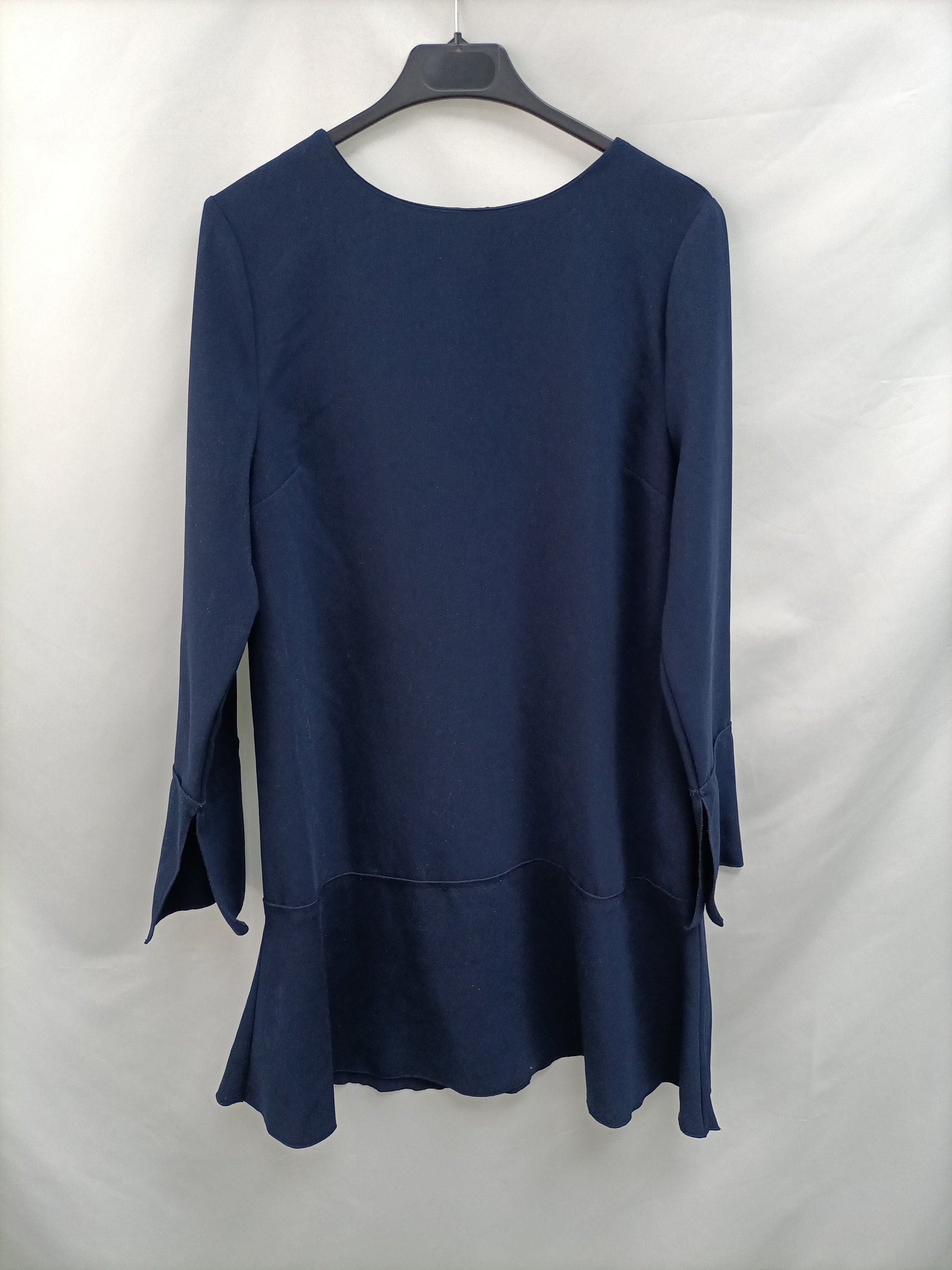 Vestido azul midi con vuelo se abrocha con cremallera trasera plateada las mangas tienen una apertura ancho 40 largo 87