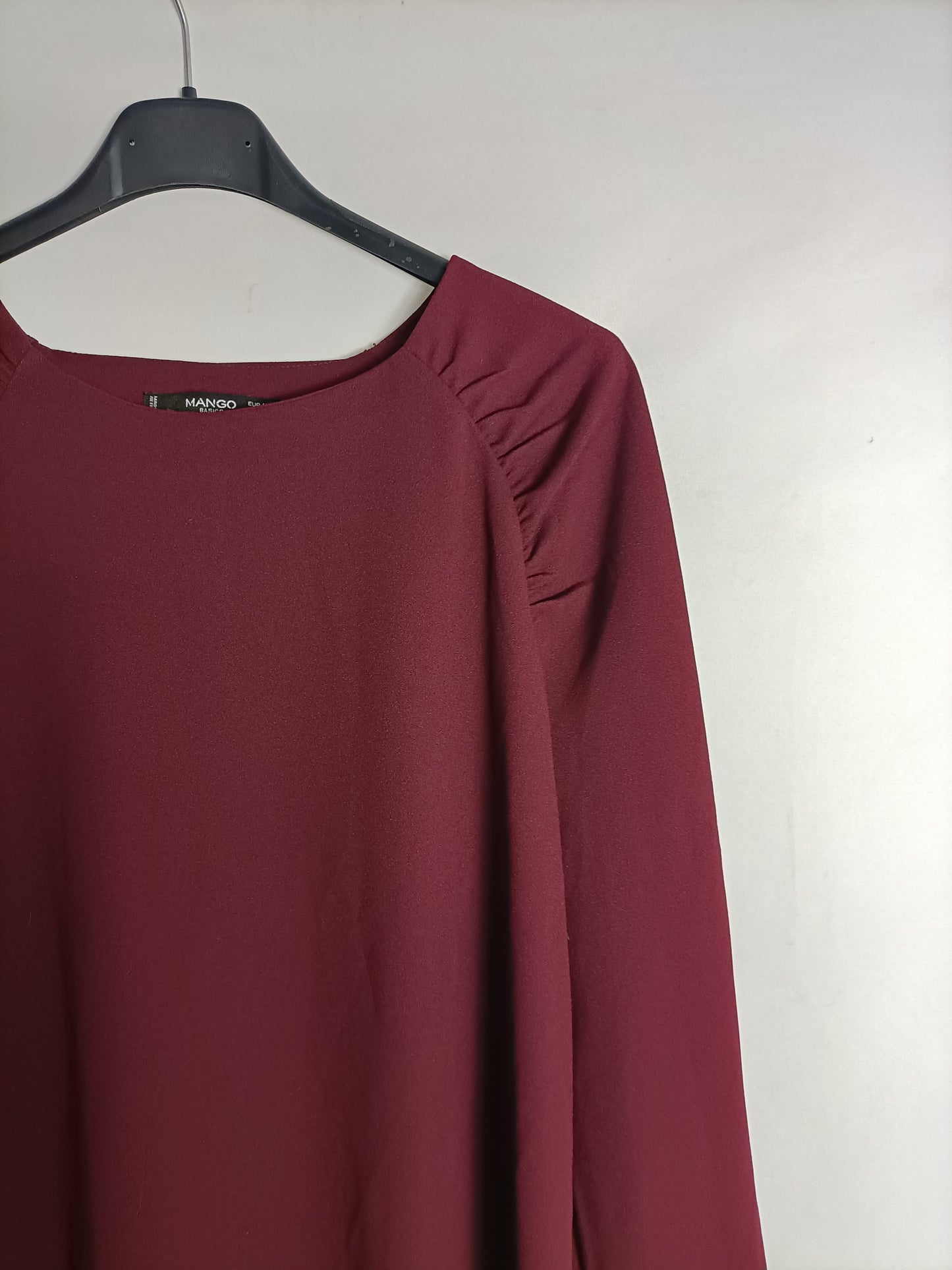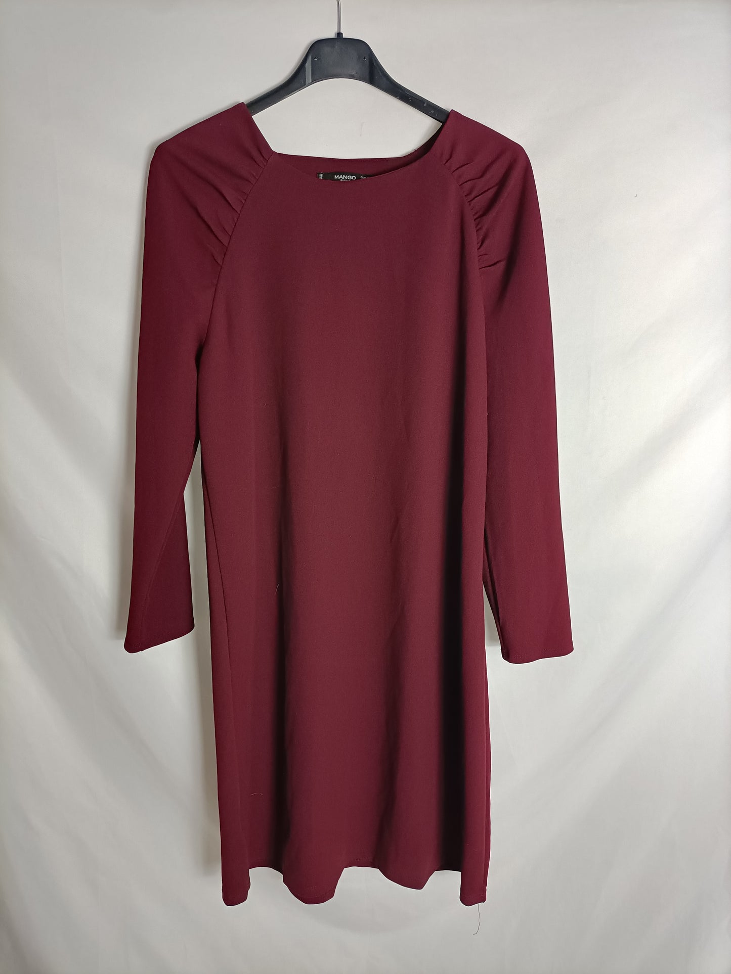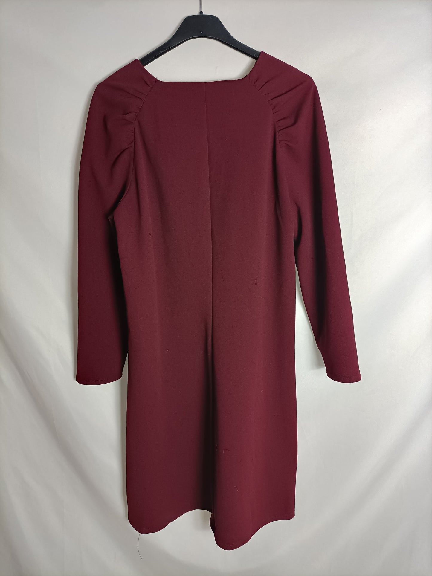 Vestido básico burdeos, con detalles fruncidos en la parte superior.